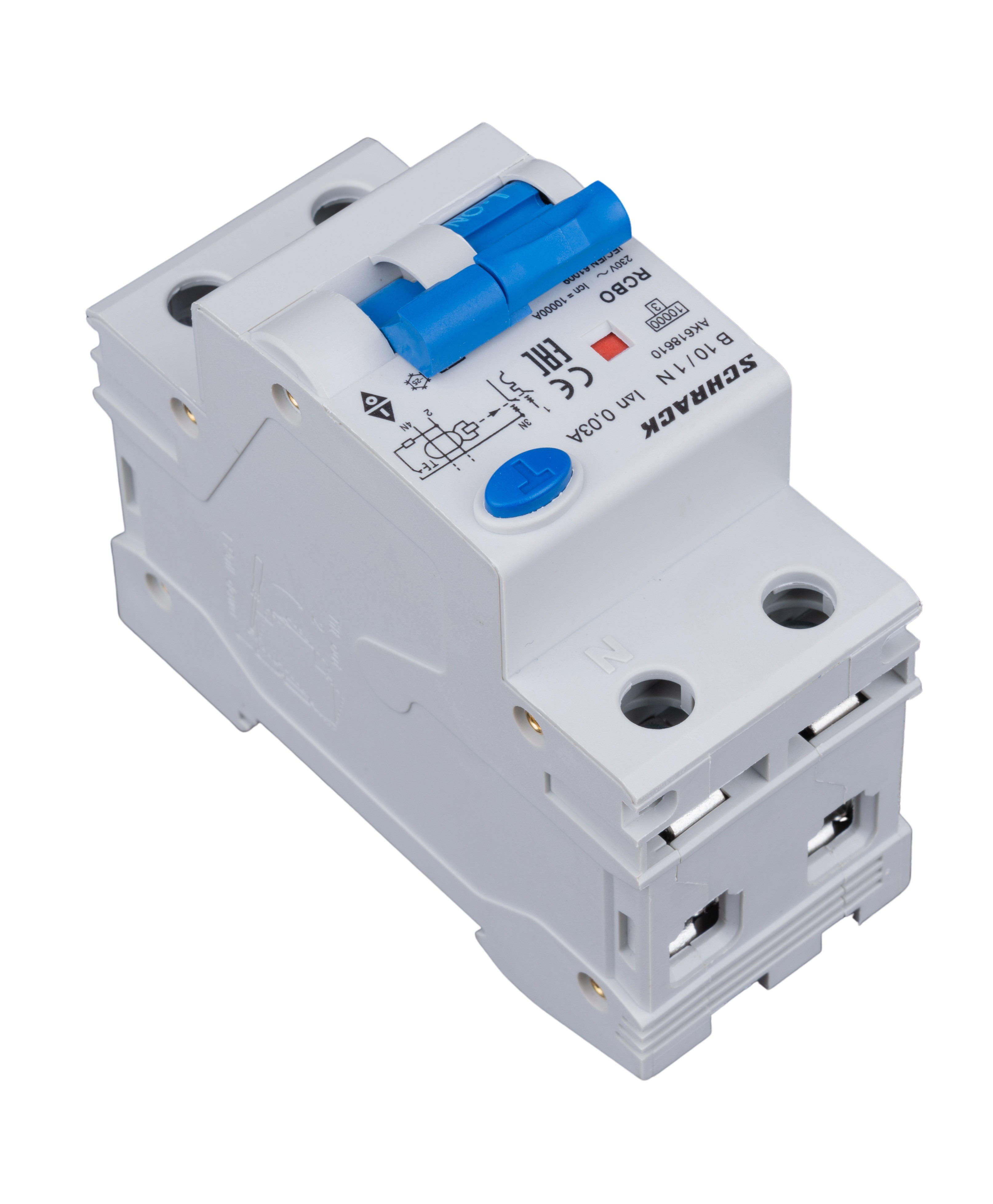 Automatic circuit breaker with integrated RCD (residual current device) from the AMPARO series by Schrack manufacturer. The device is designed to protect electrical circuits from overcurrents and earth faults simultaneously.