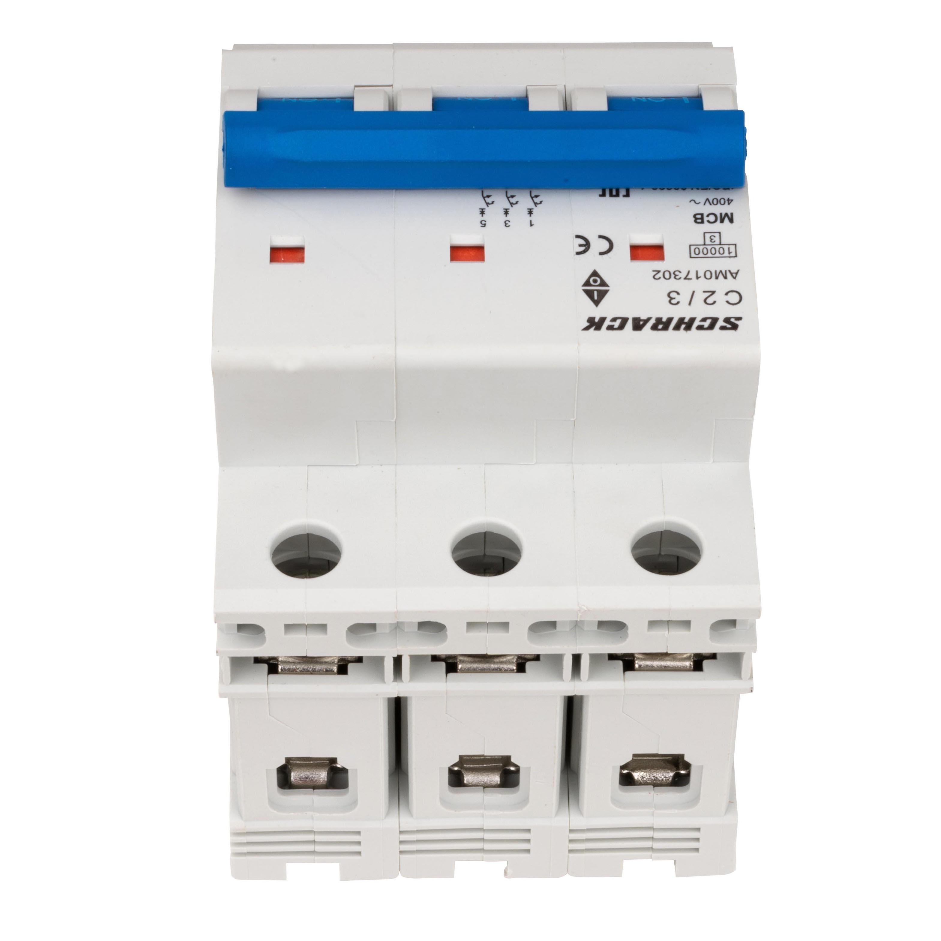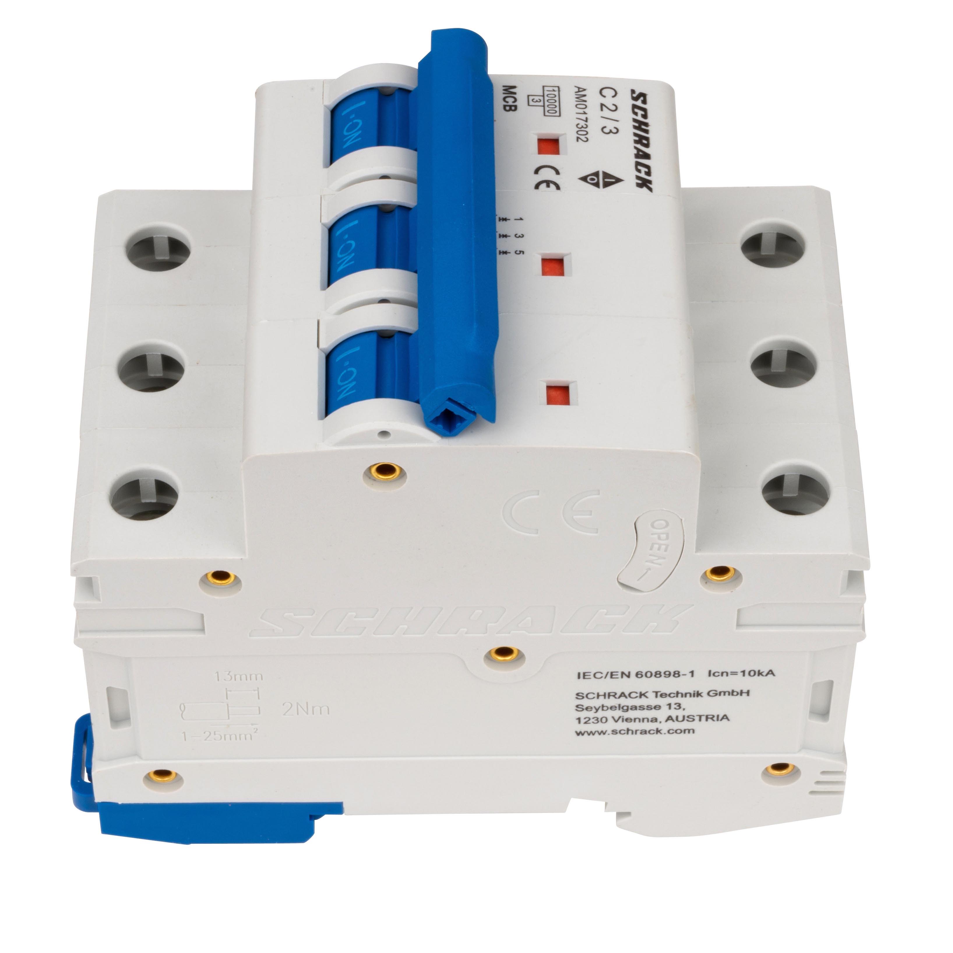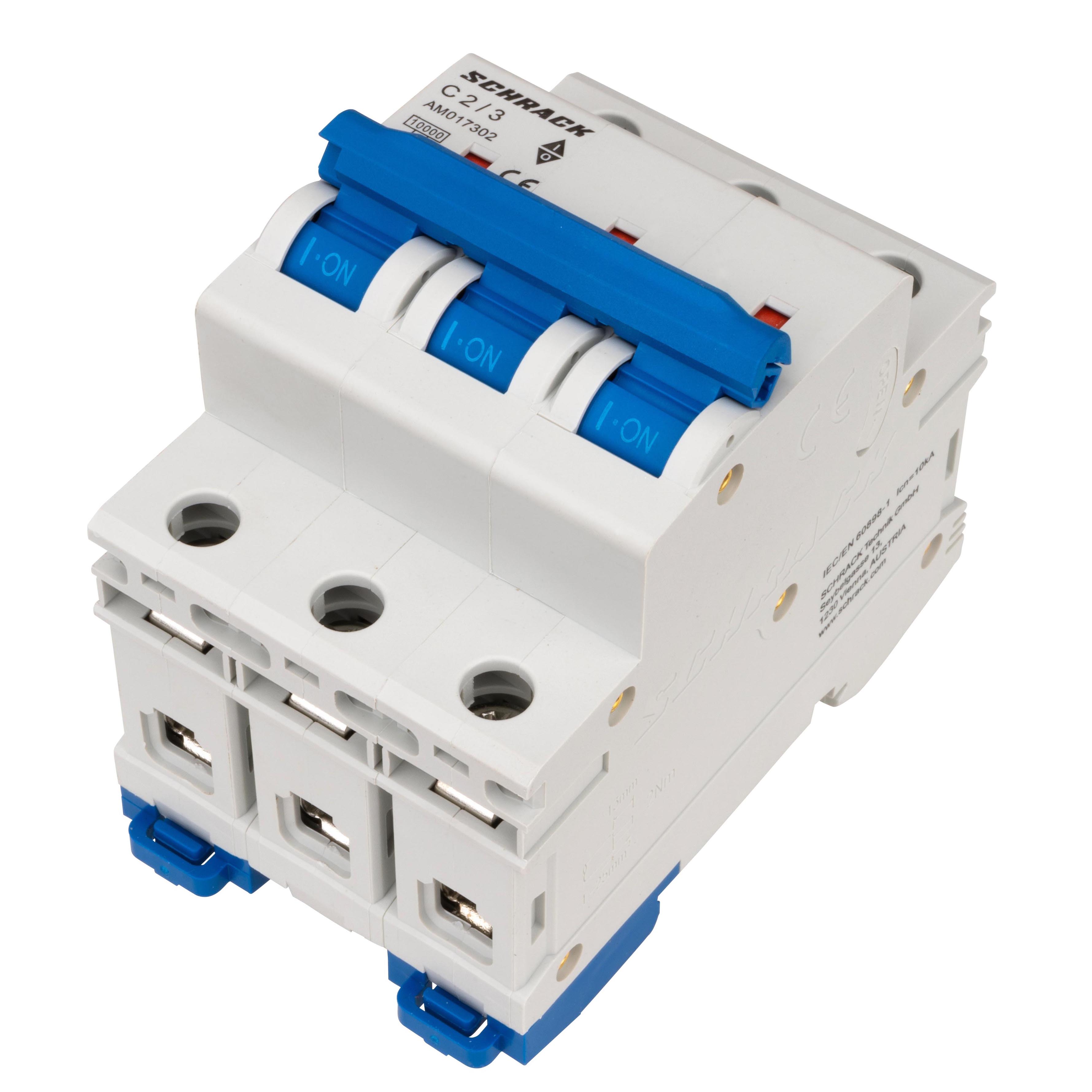 Three-pole automatic circuit breaker of the AMPARO series, AM10 type manufactured by Schrack. Designed for protection of electrical circuits against overloads and short circuits.
