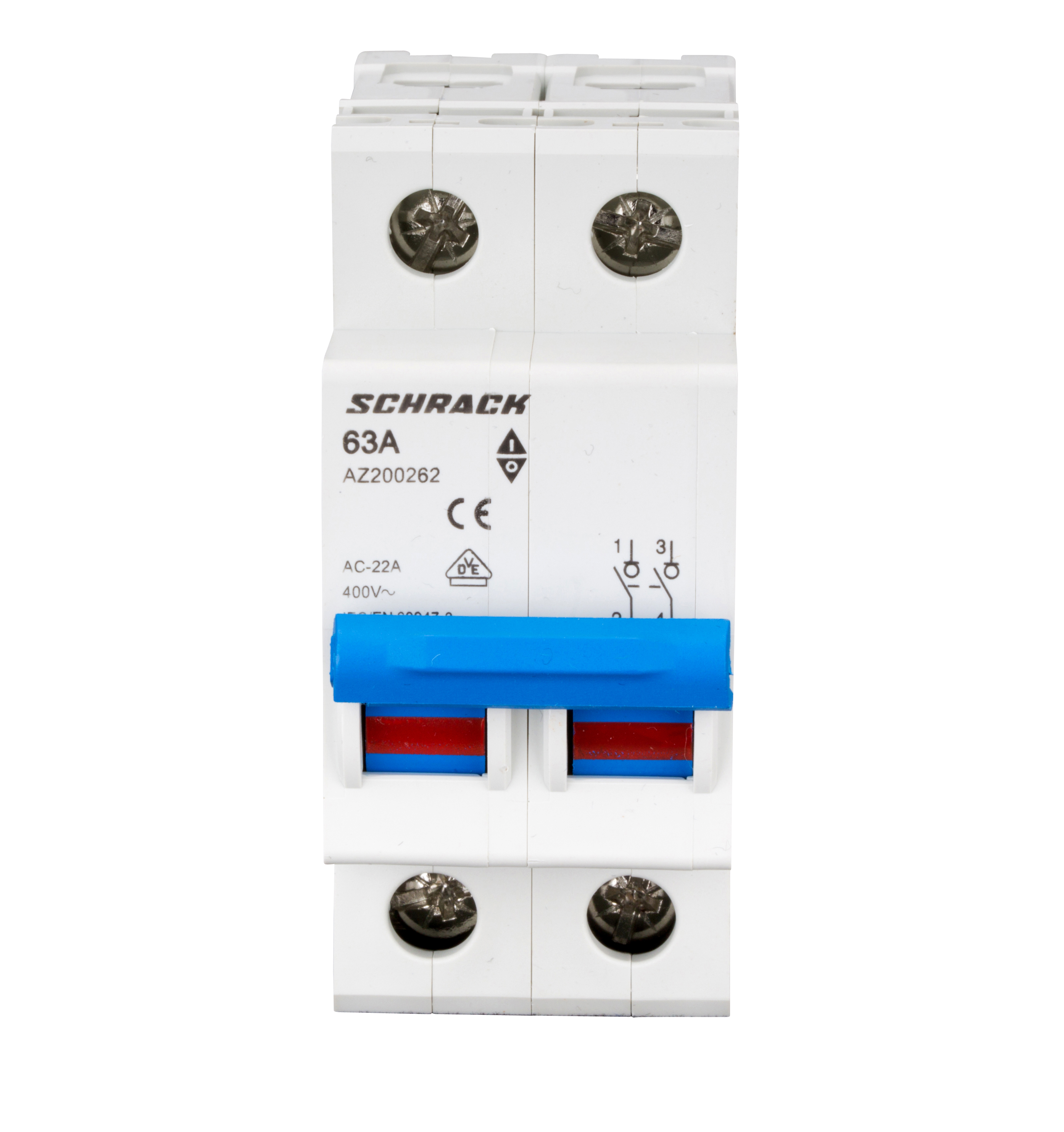 Load disconnector designed for switching electrical circuits with a rated current of 63 A at voltages up to 660 V. Two-pole design allows simultaneous disconnection of both load poles.