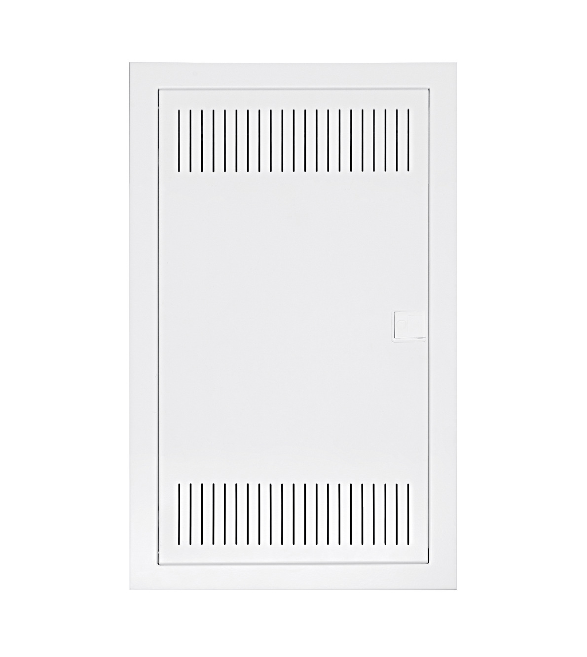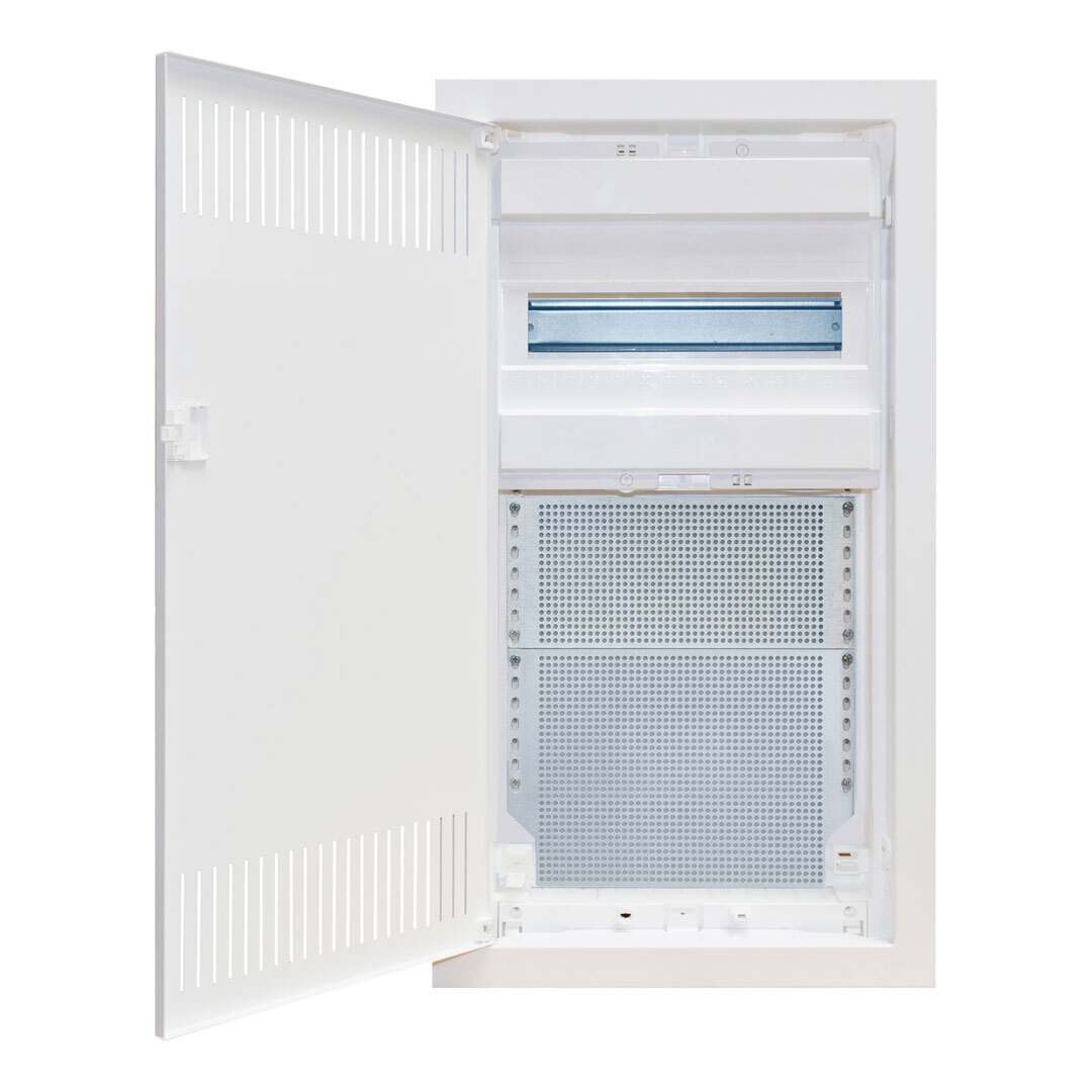 A flush-mounted combined distribution board designed for concealed wall installation. The board is rated for 12 modules + 2 modules + 2 IT mounting panels in a single row. Equipped with a metal door in RAL 9003 color (signal white) and provides secure storage for electrical equipment.