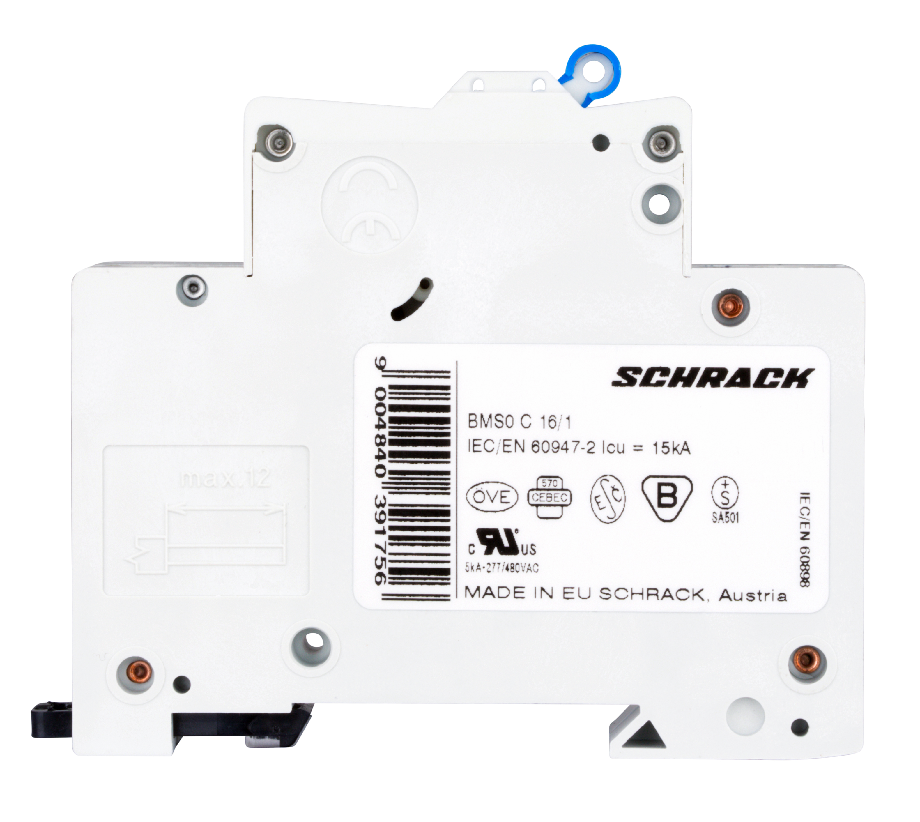 A single-pole automatic circuit breaker from Schrack's BMS0 series designed to protect electrical circuits from overloads and short circuits.