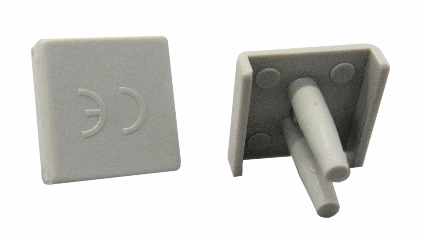 End cap designed for protection and insulation of 2-pole busbars. Used in electrical distribution systems for sealing open contacts and preventing accidental contact. Compatible with fork-type and pin-type designs with a pitch of 17.8 mm.