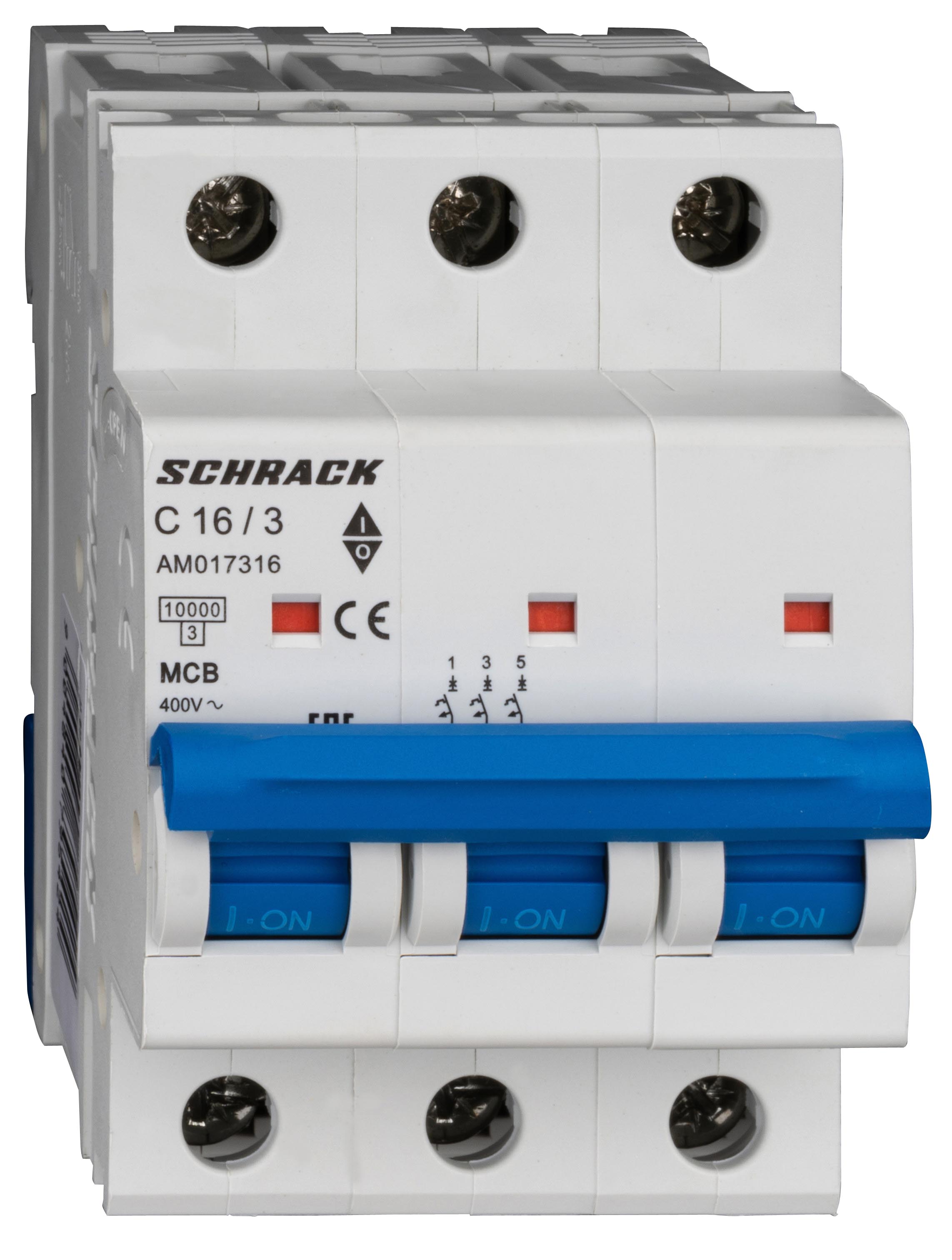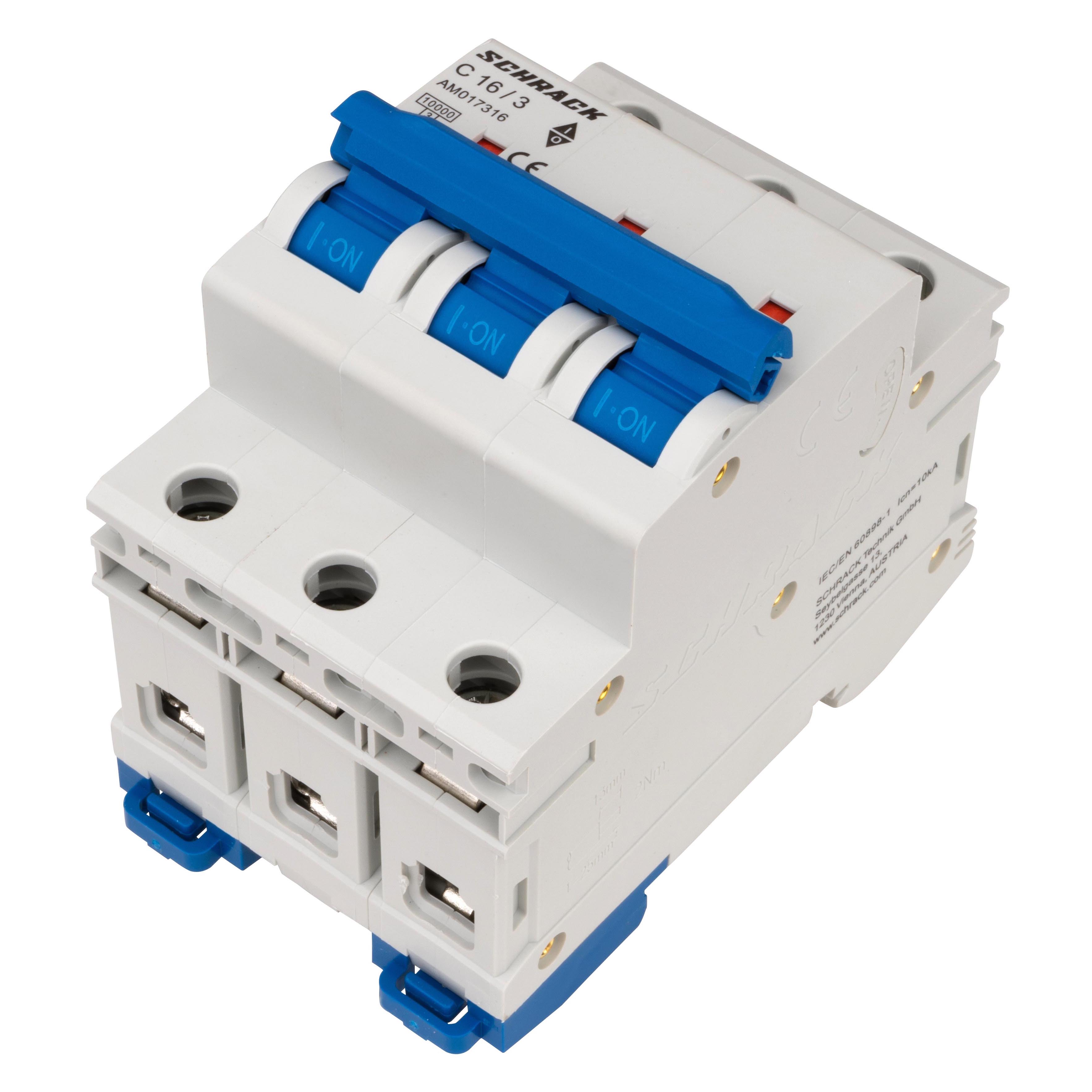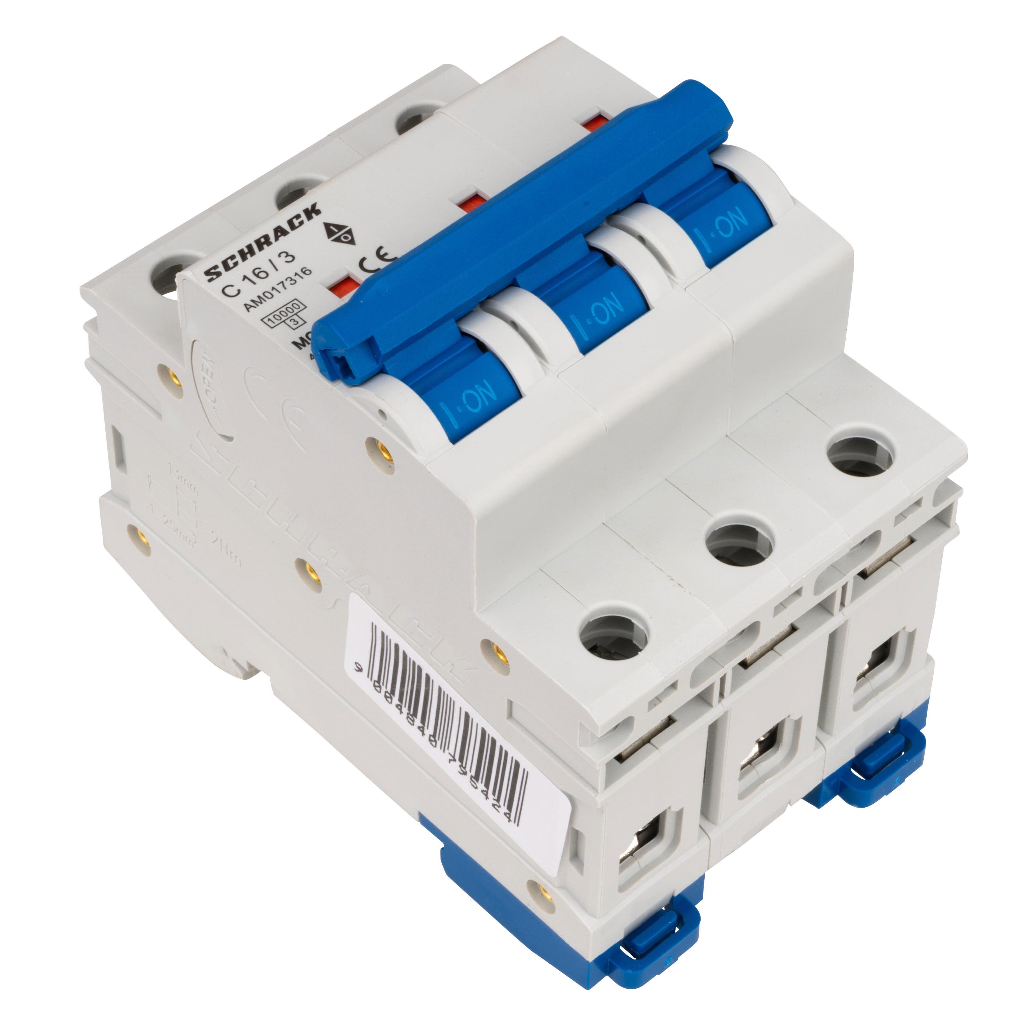 Трёхполюсный автоматический выключатель номинальным током 16А с коммутирующей способностью 10кА. Предназначен для защиты электрических цепей от перегрузок и токов короткого замыкания в распределительных щитах и панелях управления.