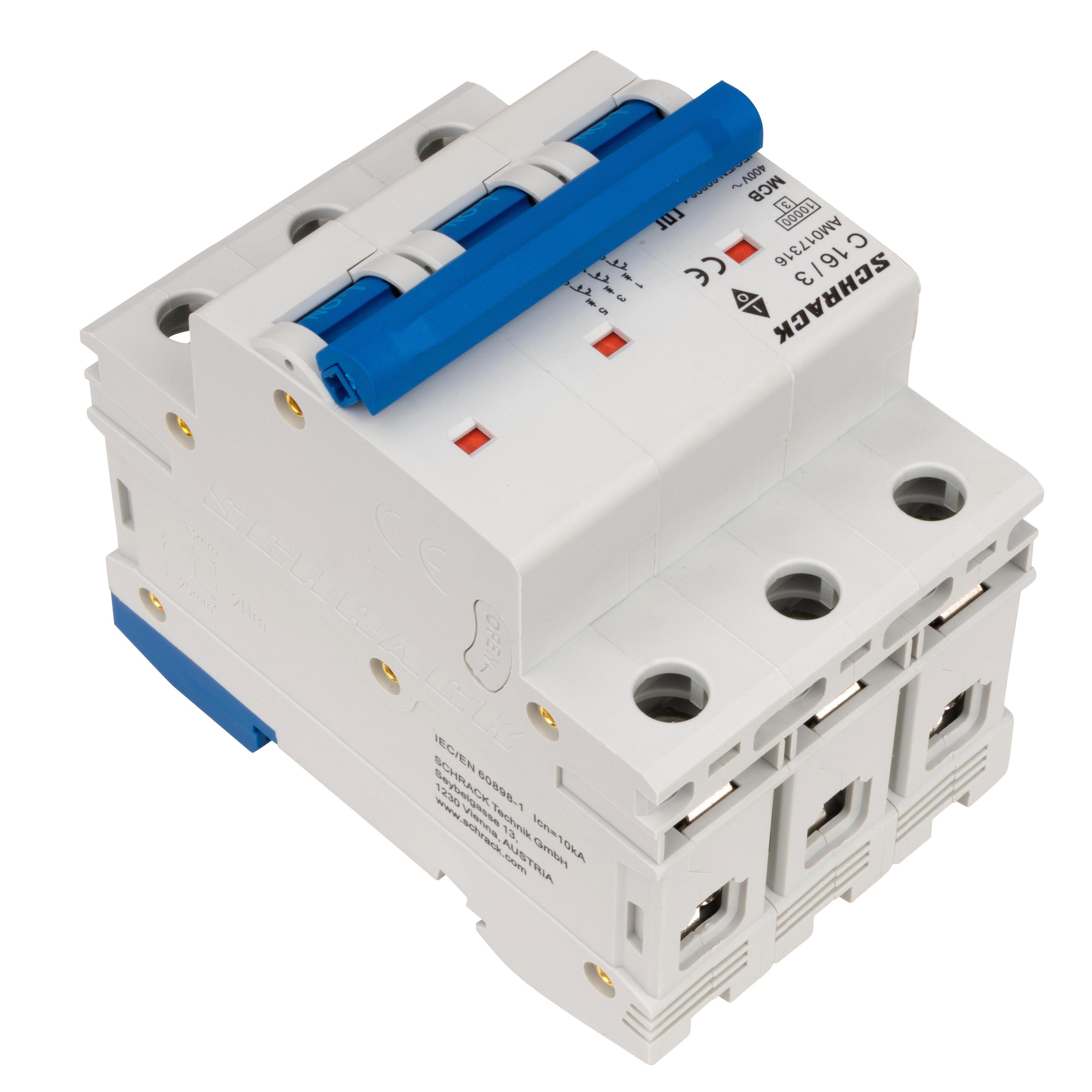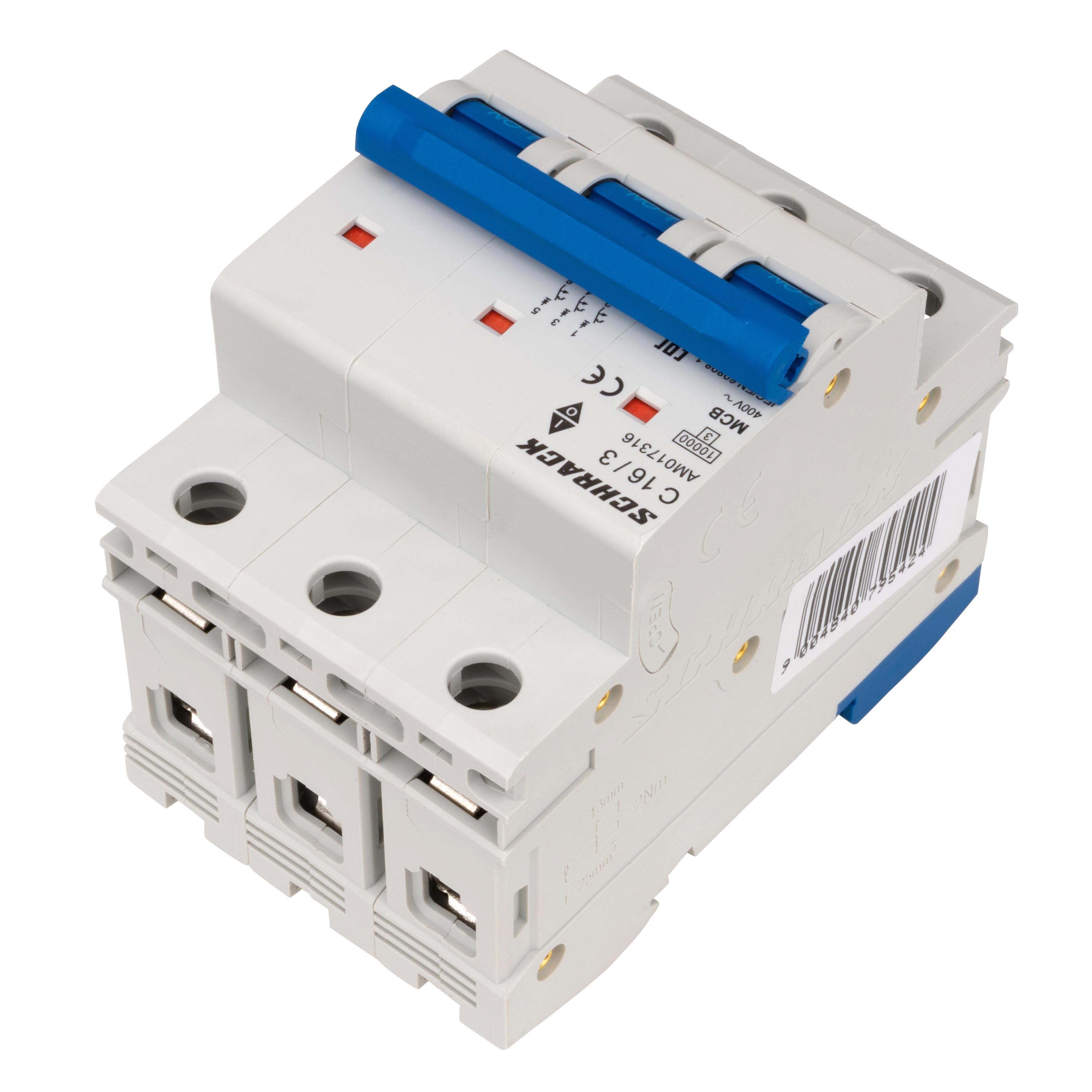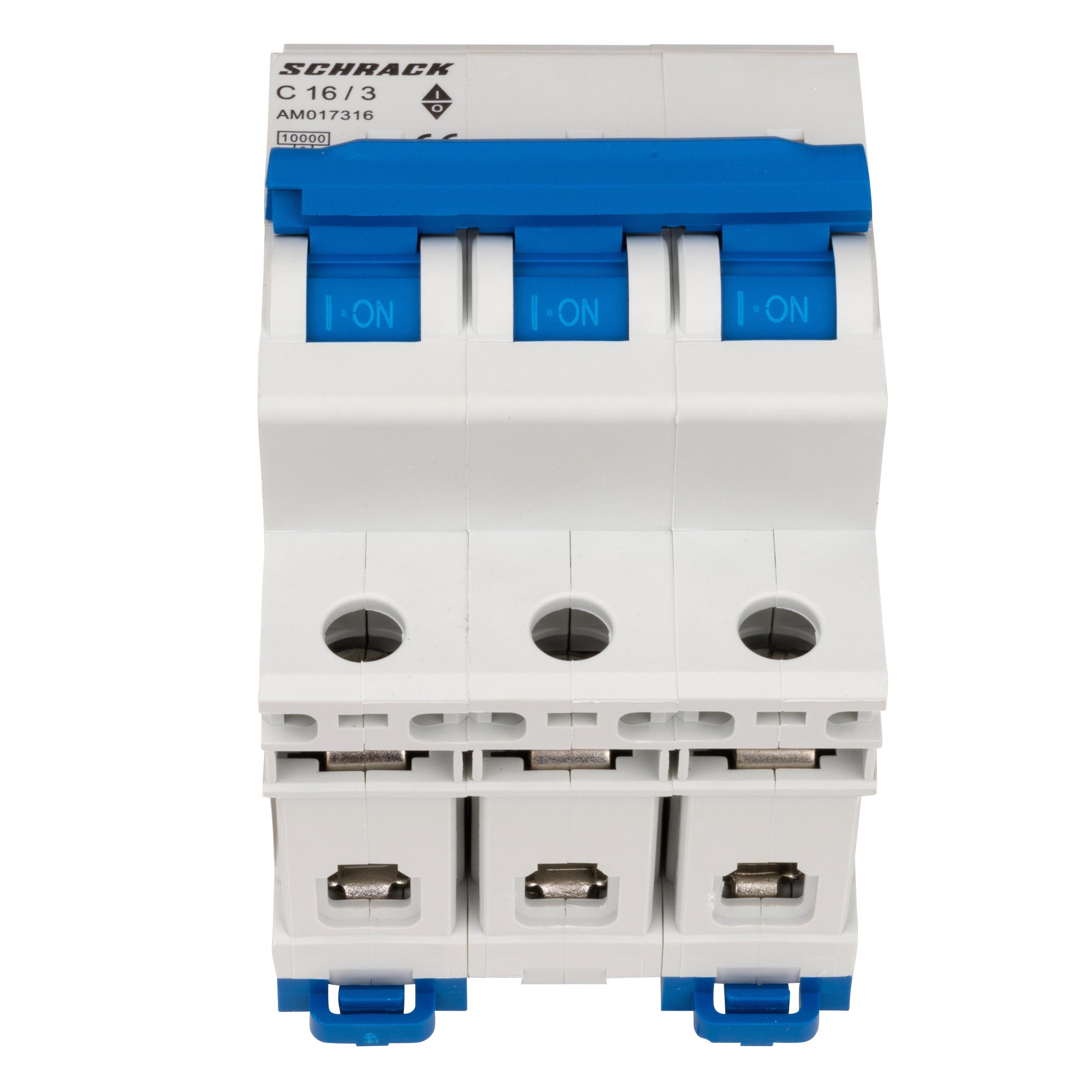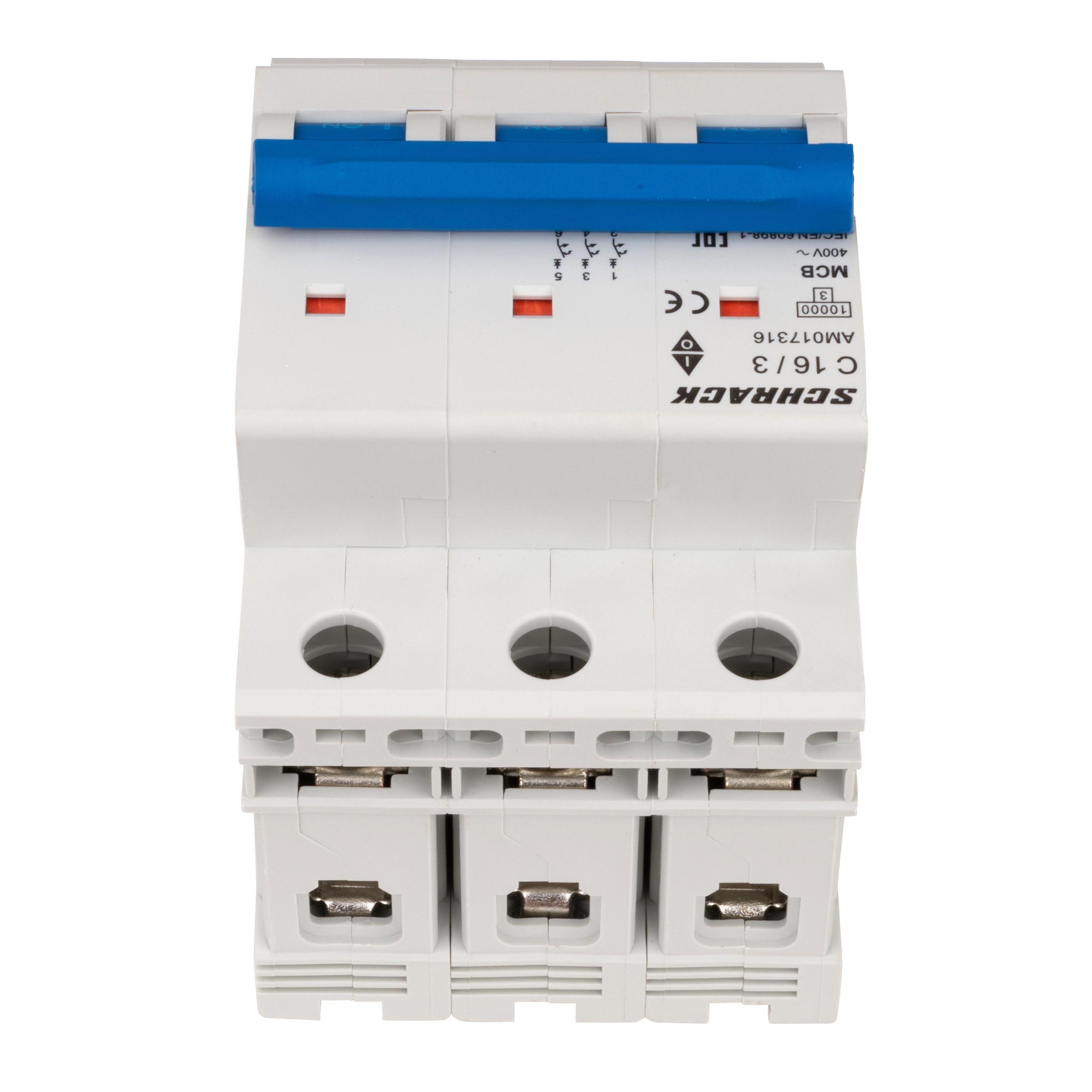 Трёхполюсный автоматический выключатель номинальным током 16А с коммутирующей способностью 10кА. Предназначен для защиты электрических цепей от перегрузок и токов короткого замыкания в распределительных щитах и панелях управления.