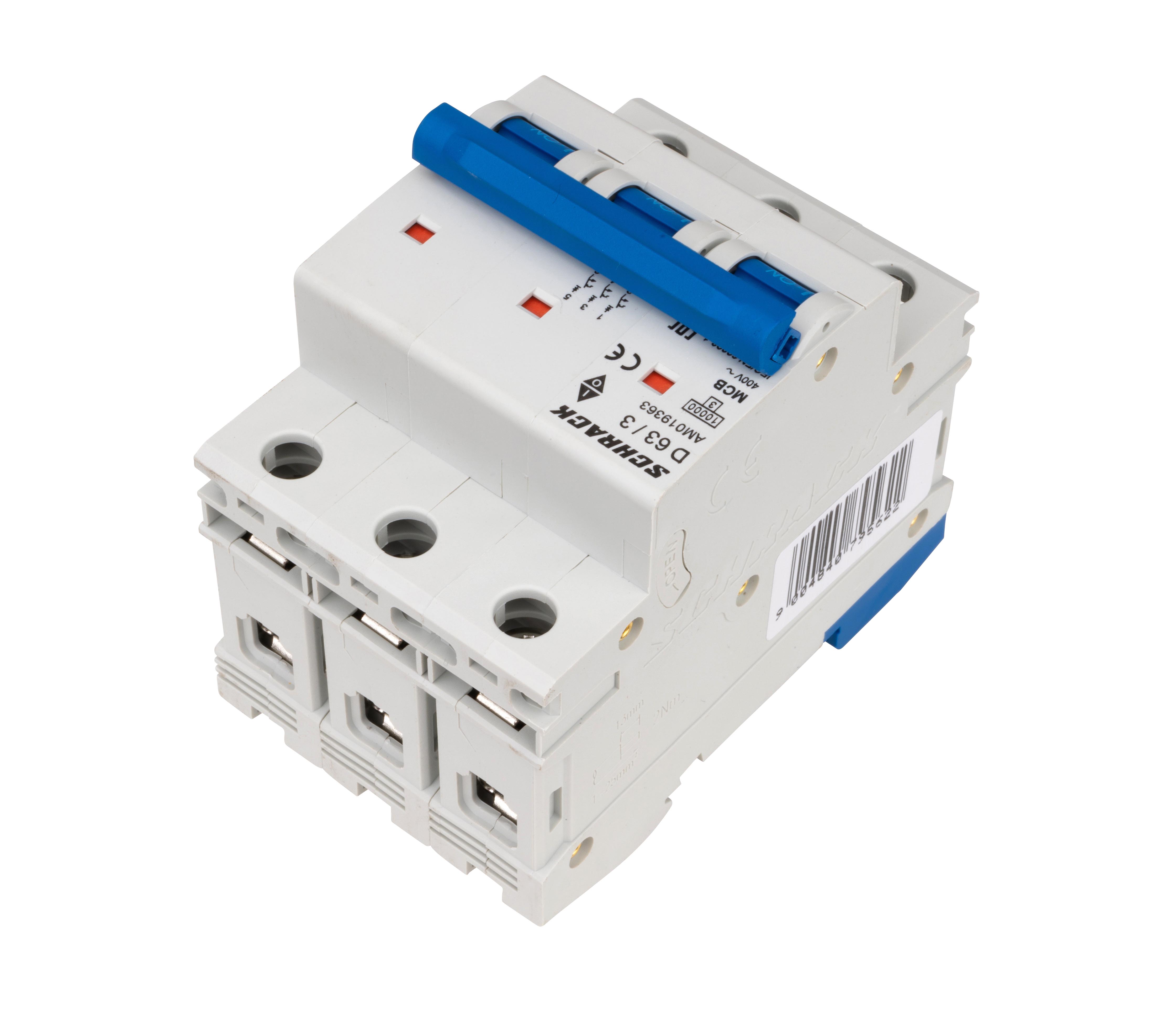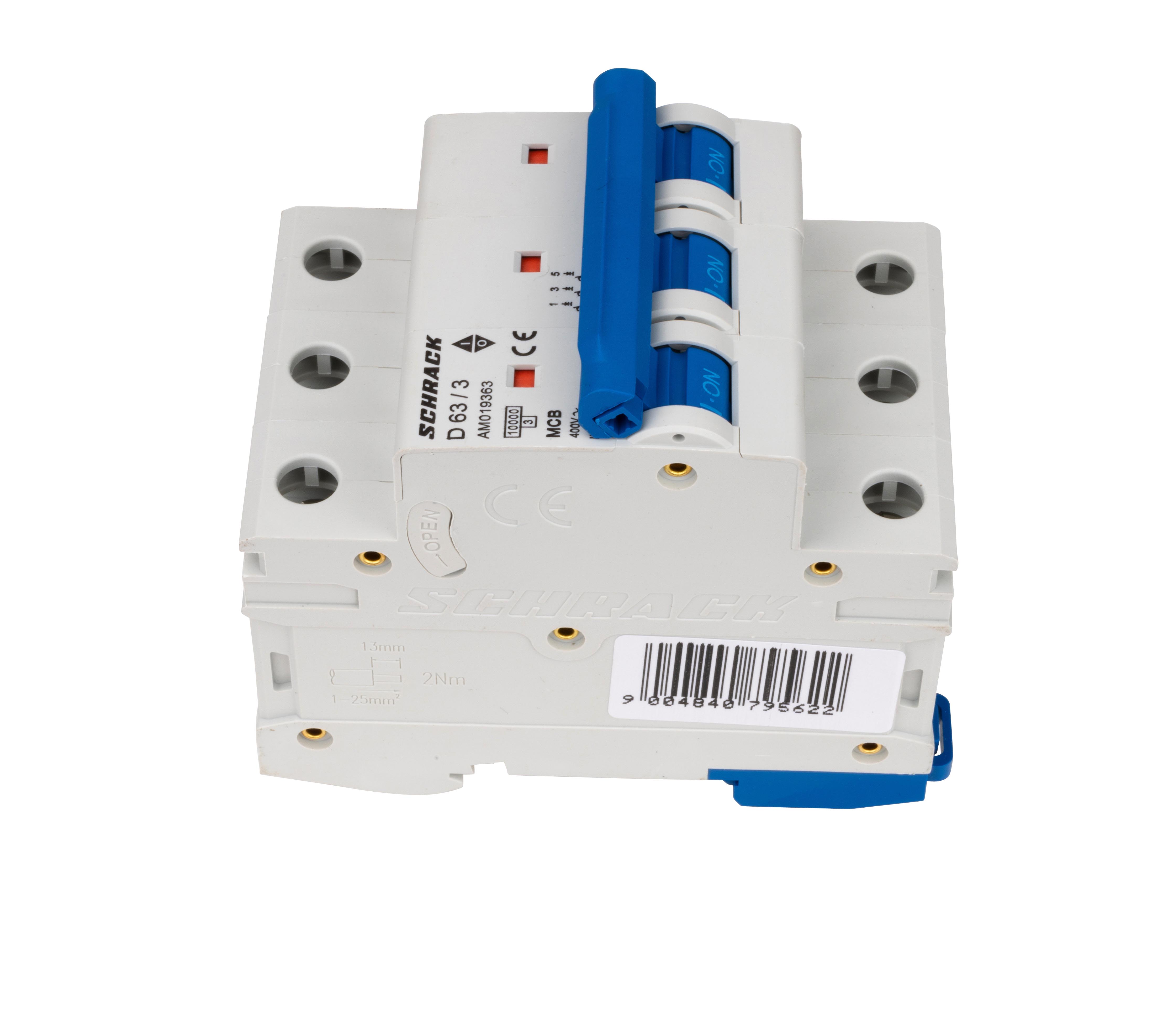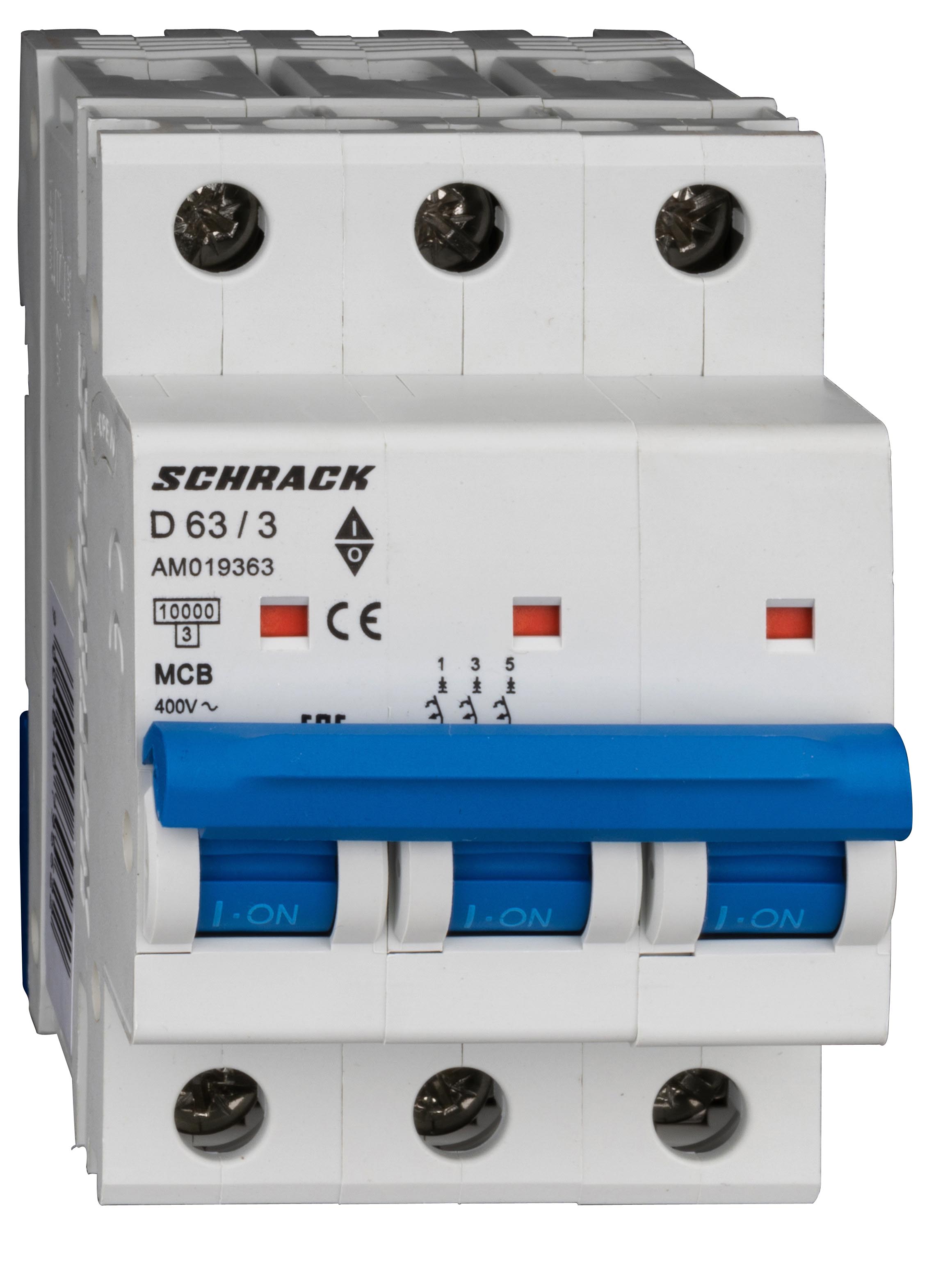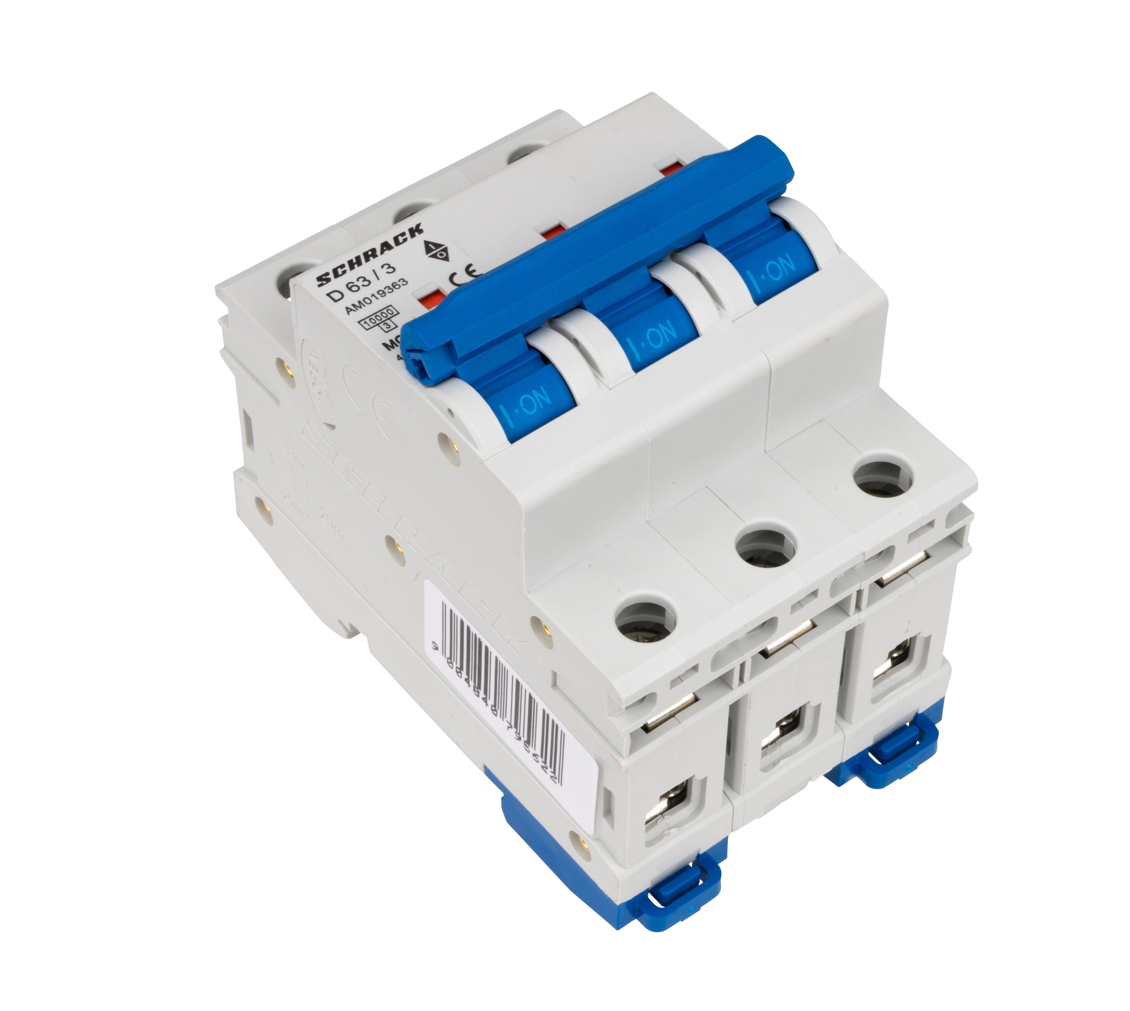 Трёхполюсный автоматический выключатель номинальным током 63 А с характеристикой срабатывания D и коммутирующей способностью 10 кА. Предназначен для защиты электрических цепей переменного тока от перегрузок и токов короткого замыкания.