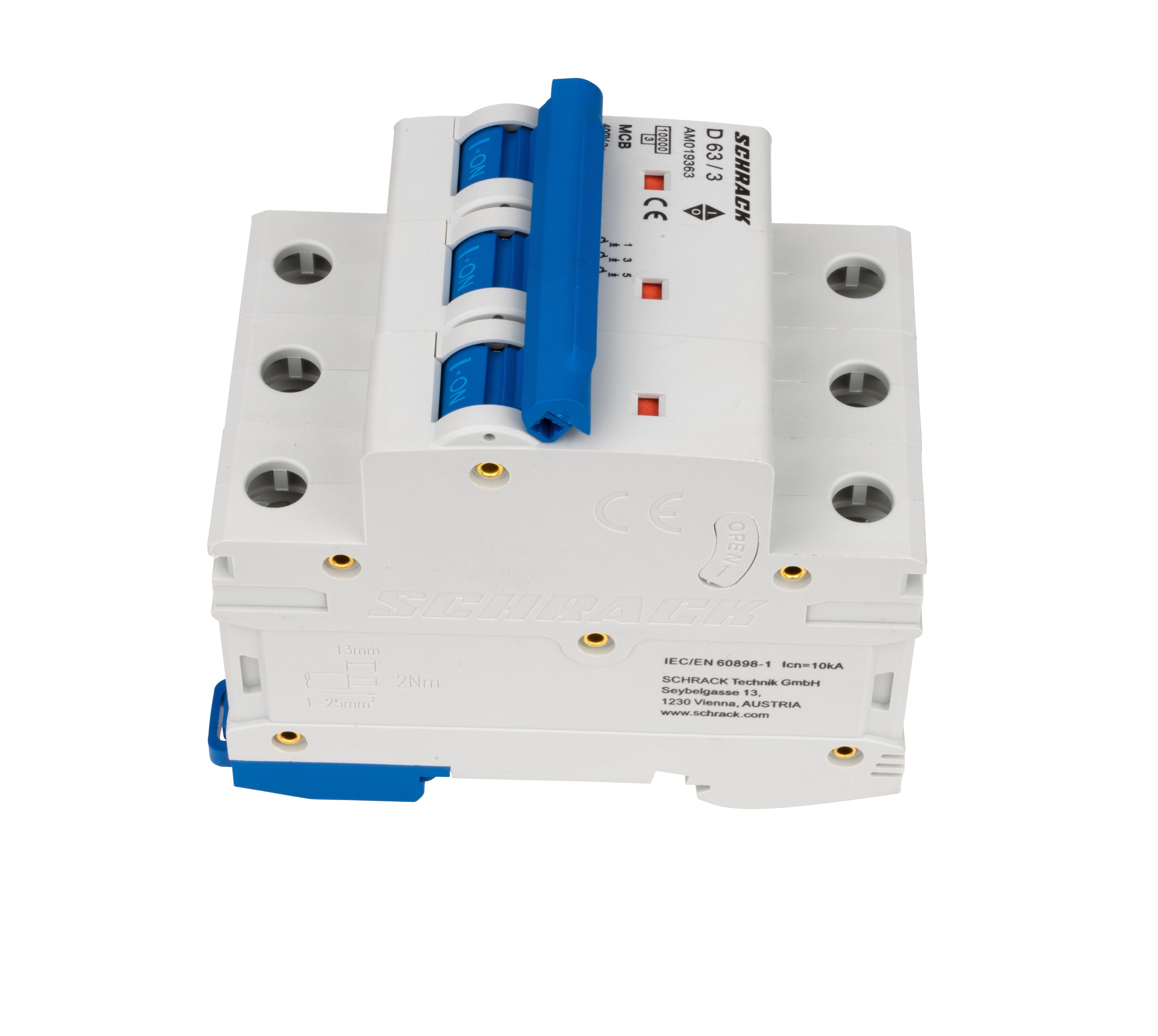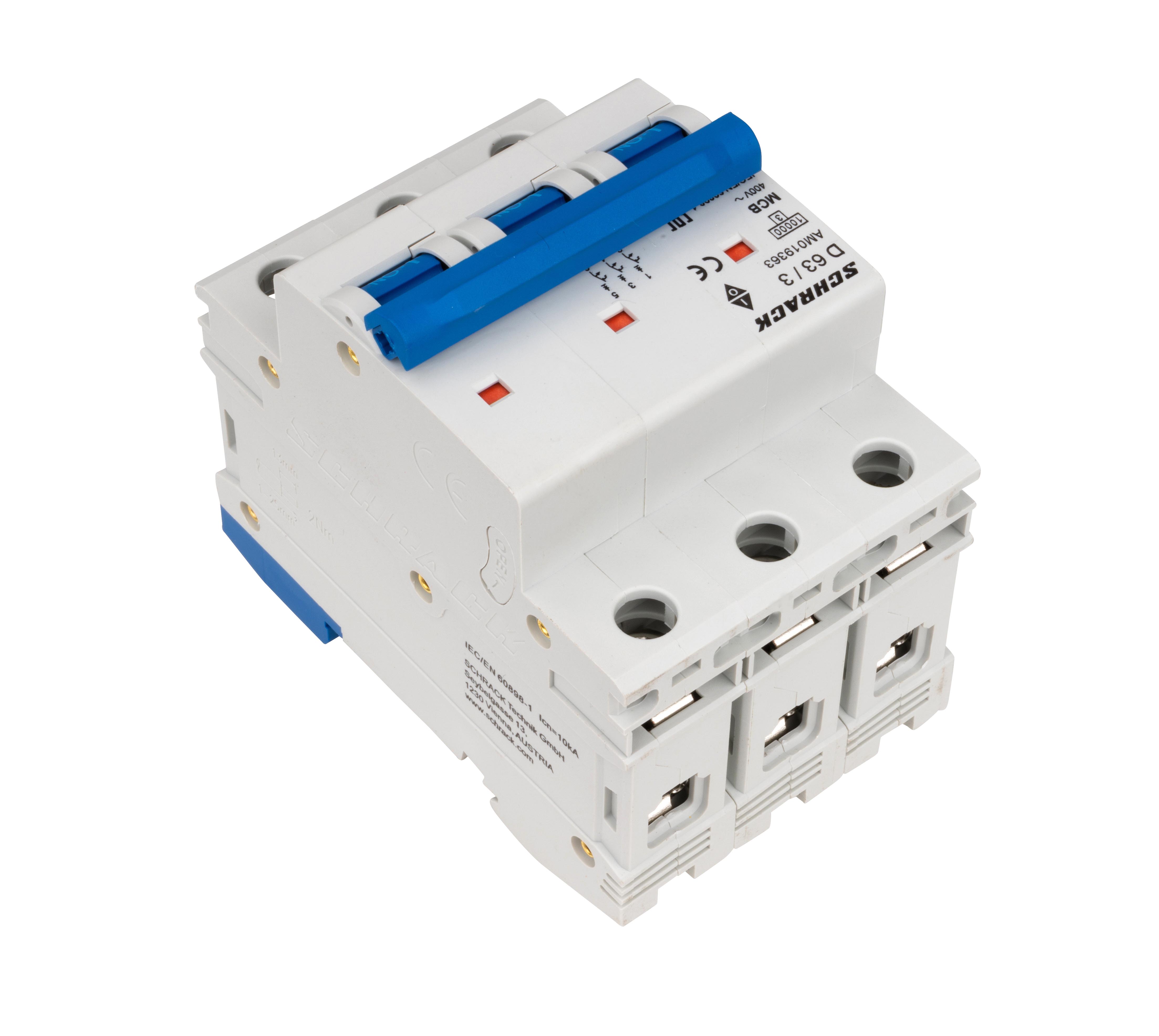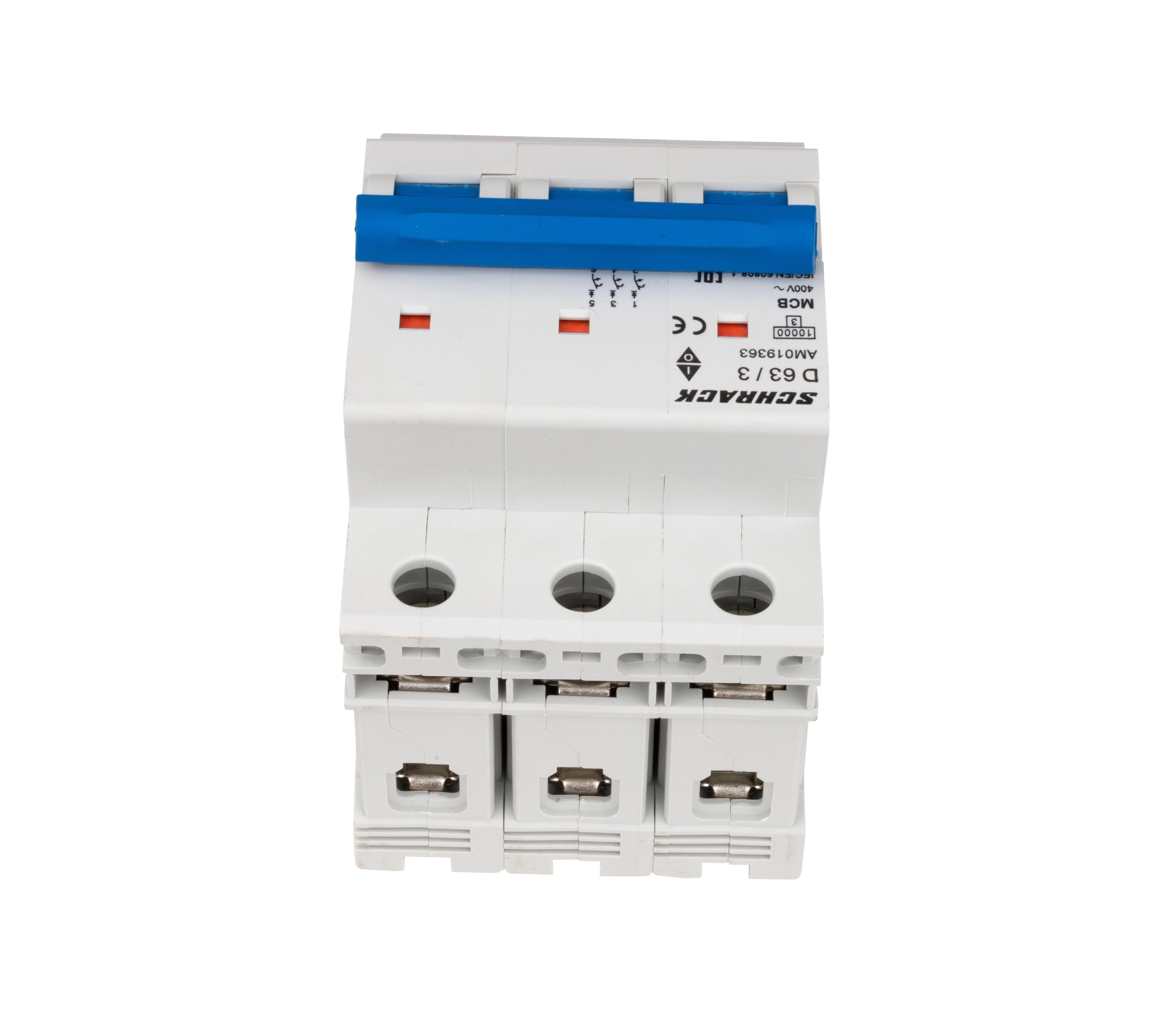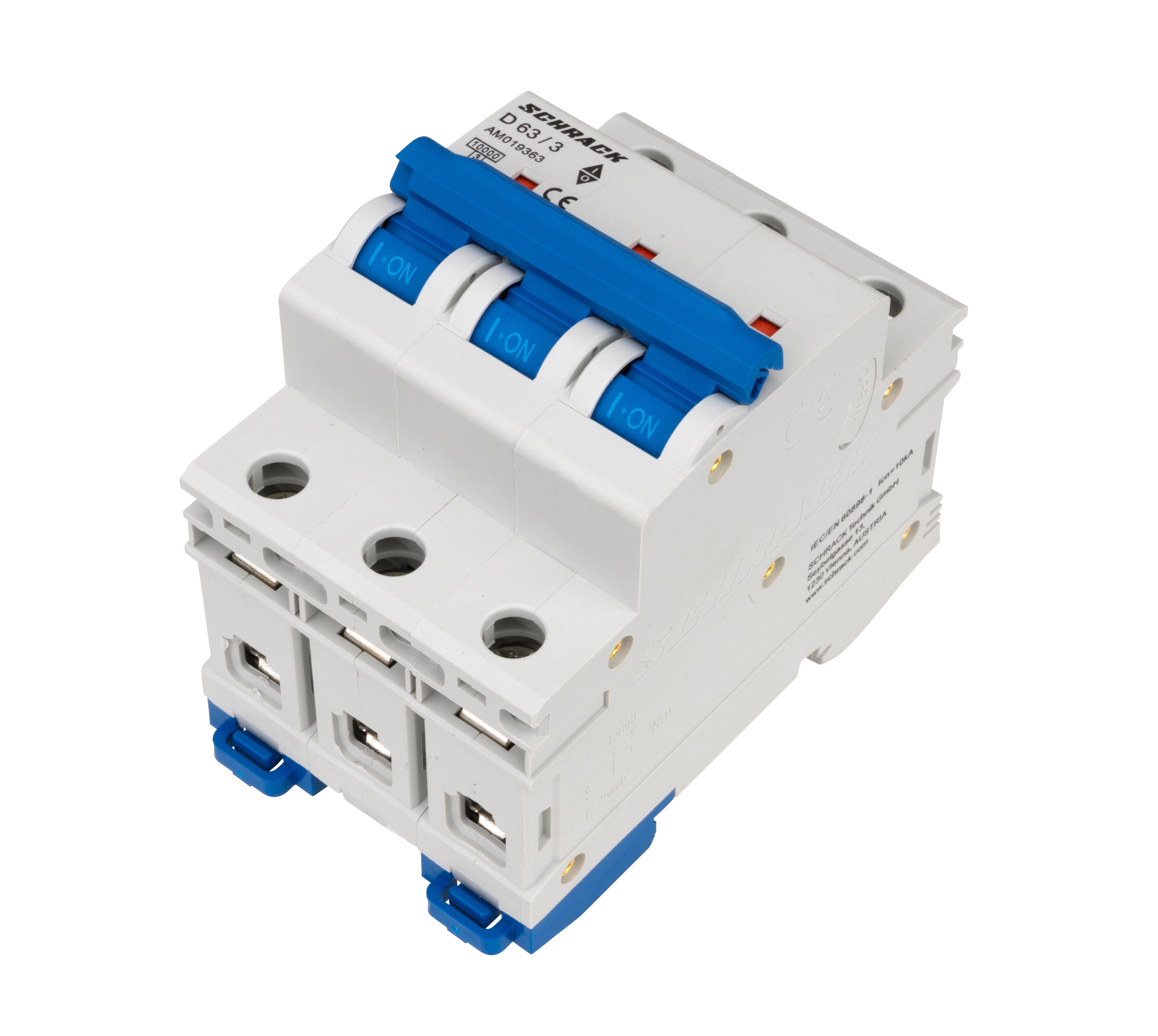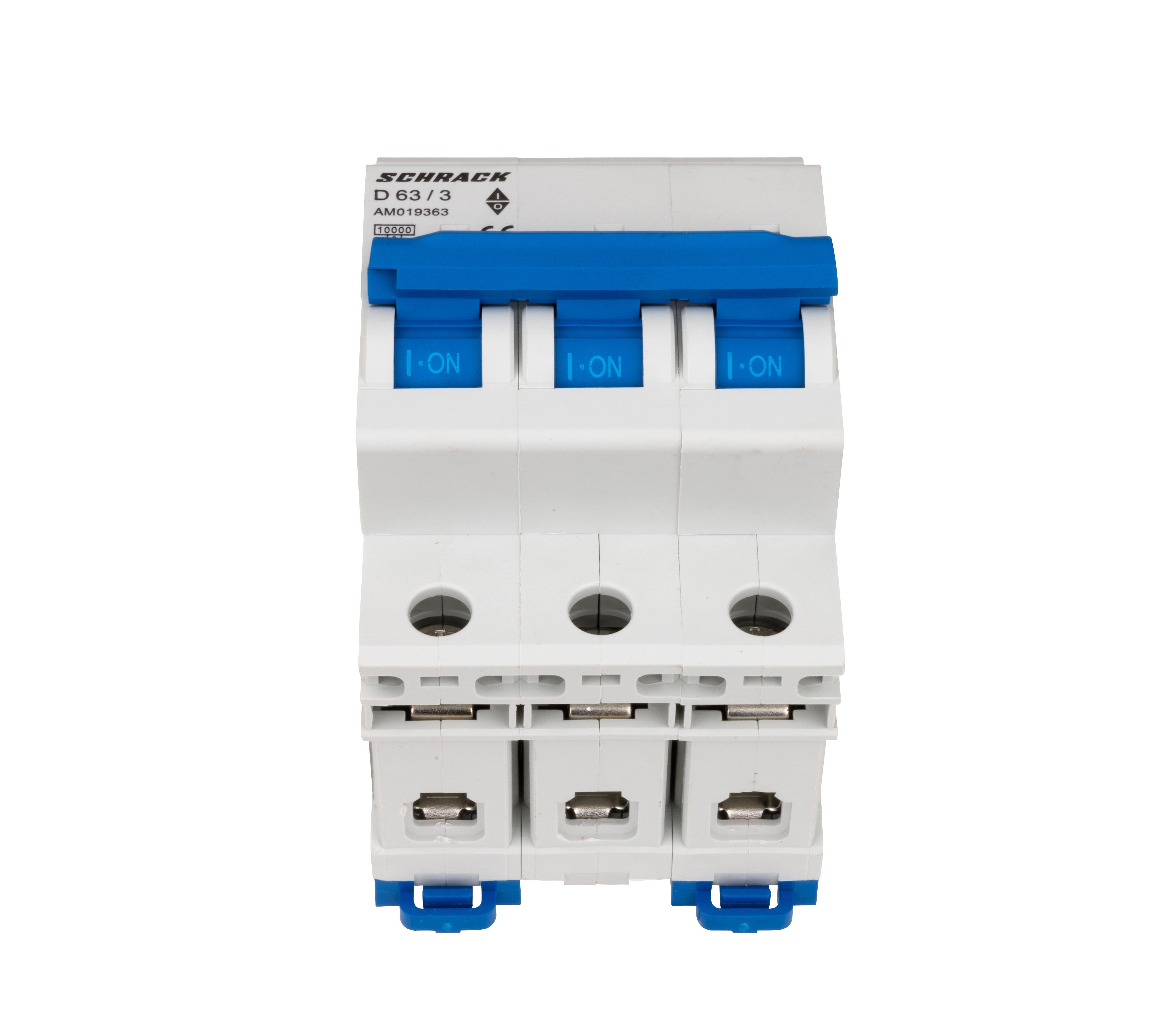 Трёхполюсный автоматический выключатель номинальным током 63 А с характеристикой срабатывания D и коммутирующей способностью 10 кА. Предназначен для защиты электрических цепей переменного тока от перегрузок и токов короткого замыкания.