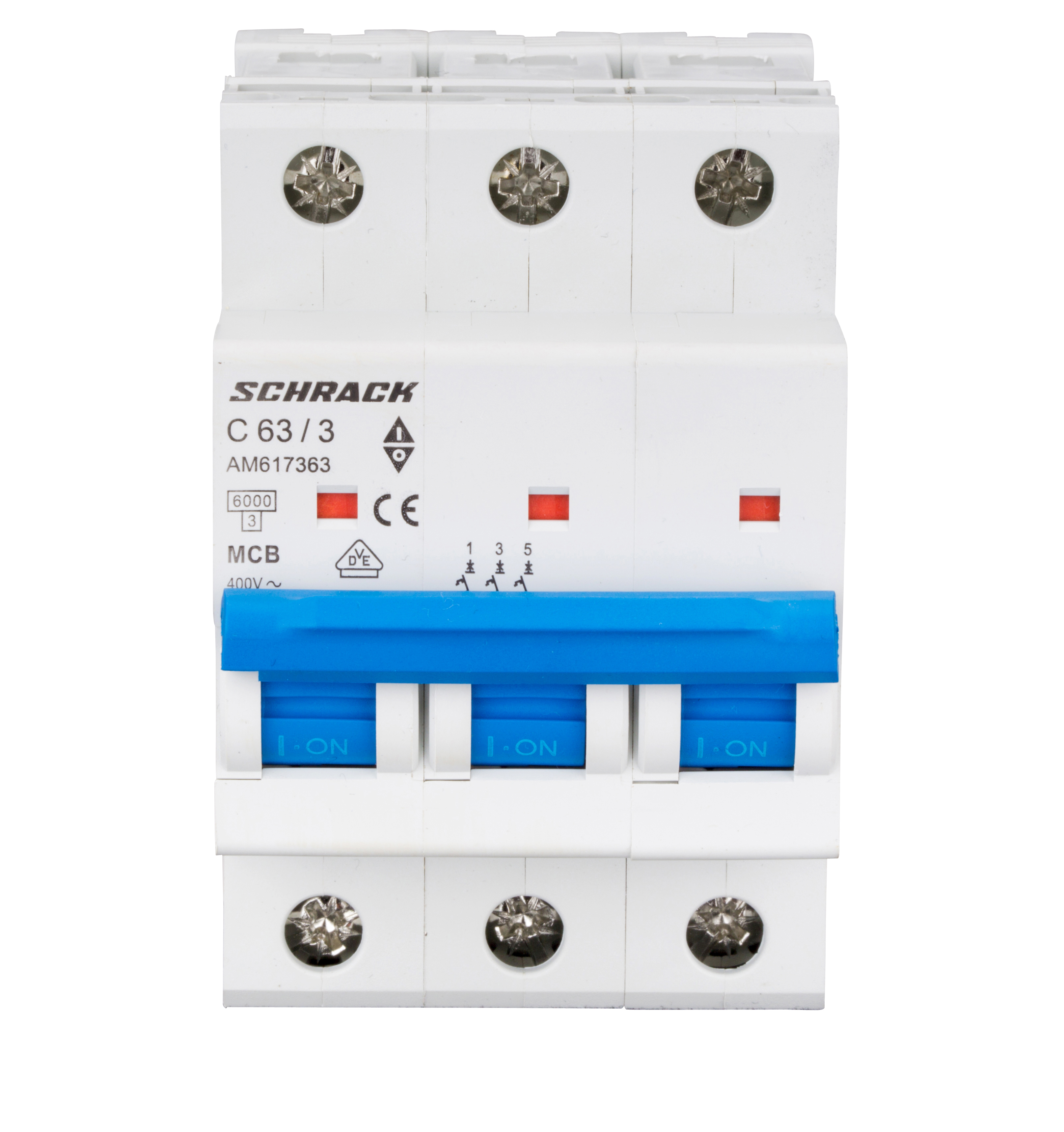 Трёхполюсный автоматический выключатель номиналом 63 А с характеристикой срабатывания C и коммутирующей способностью 6 кА. Предназначен для защиты электрических цепей от перегрузок и коротких замыканий в сетях переменного тока.