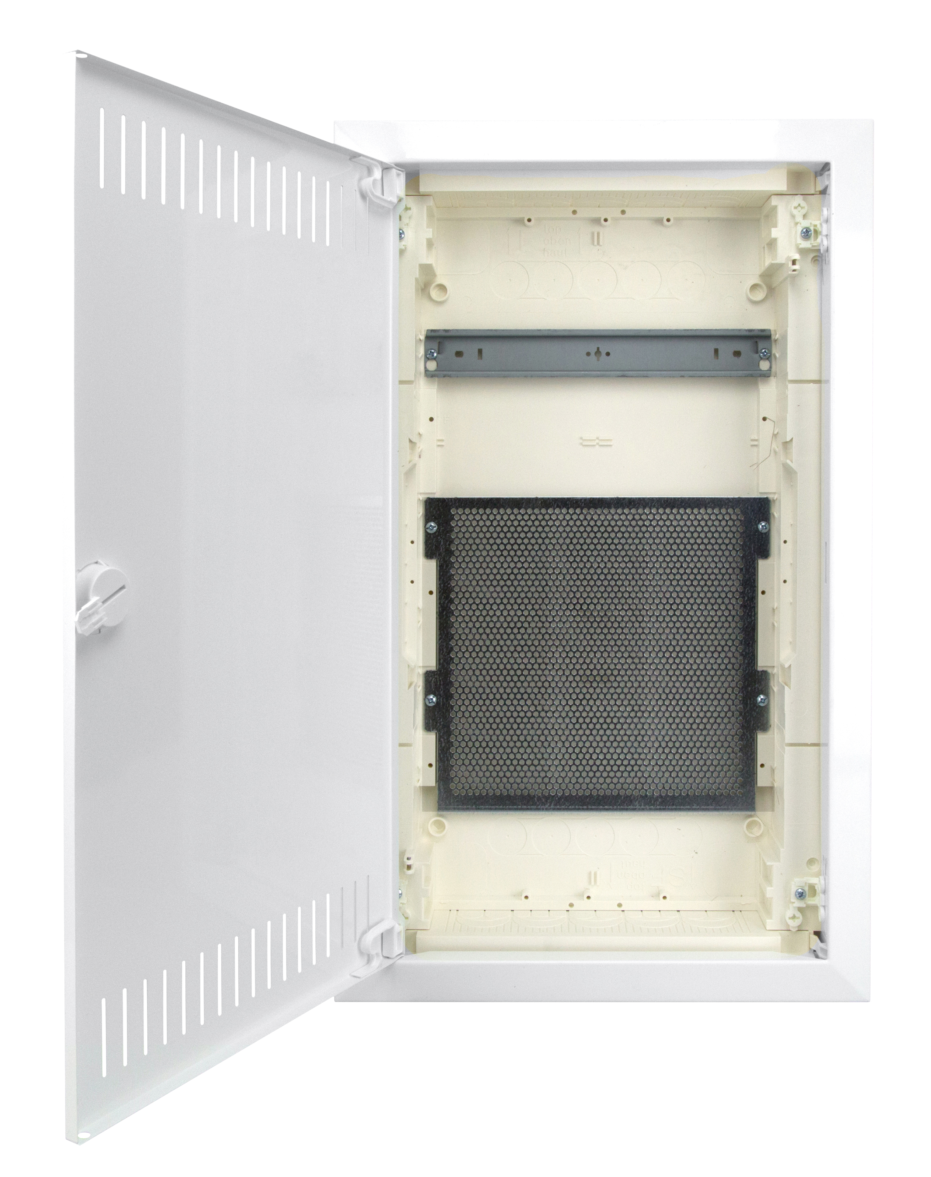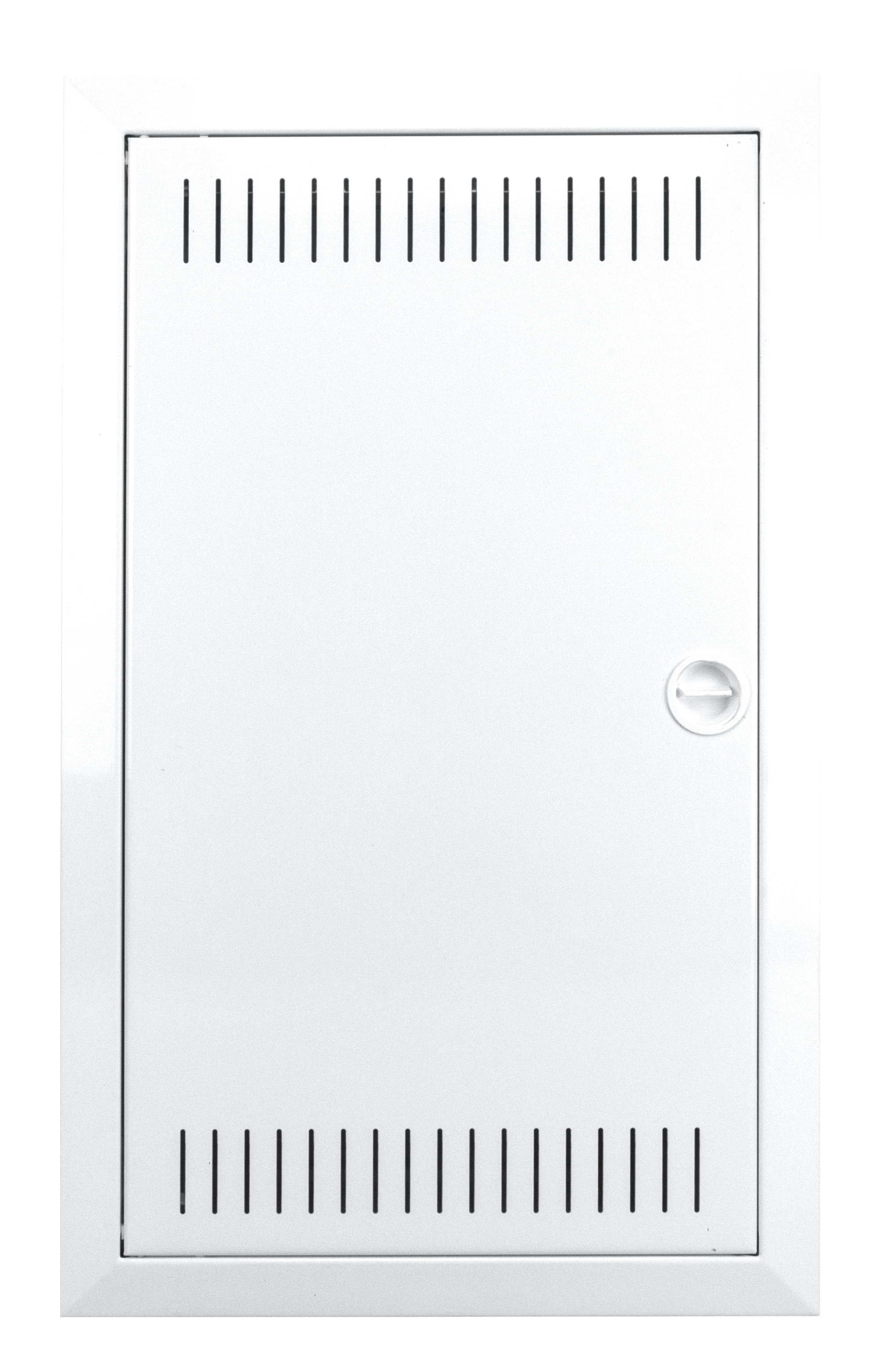 Встраиваемый щит IT для скрытого монтажа в пустотелую стену. Конструкция рассчитана на размещение модульного оборудования в трёх рядах с общей ёмкостью 12+2 модульных места (TE).