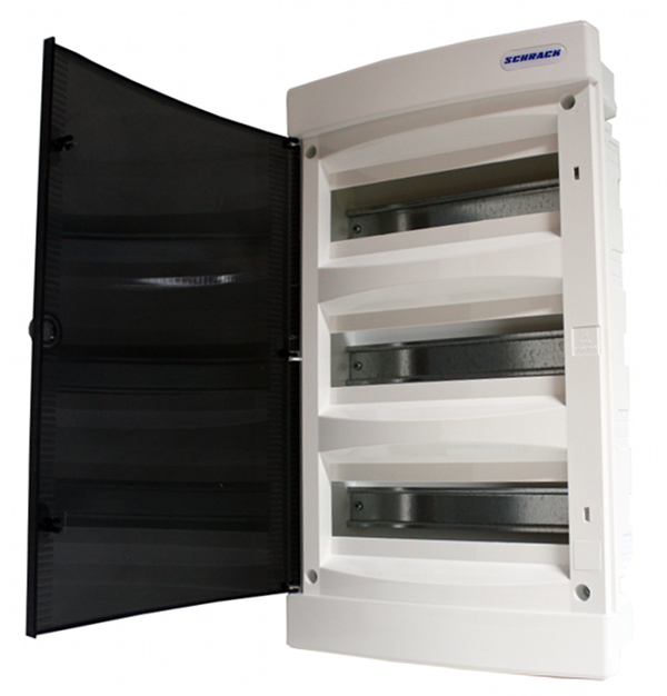 Встраиваемый распределительный щит на 36 модулей (3 ряда × 12 модулей) производства Schrack для скрытого монтажа в нишу стены.