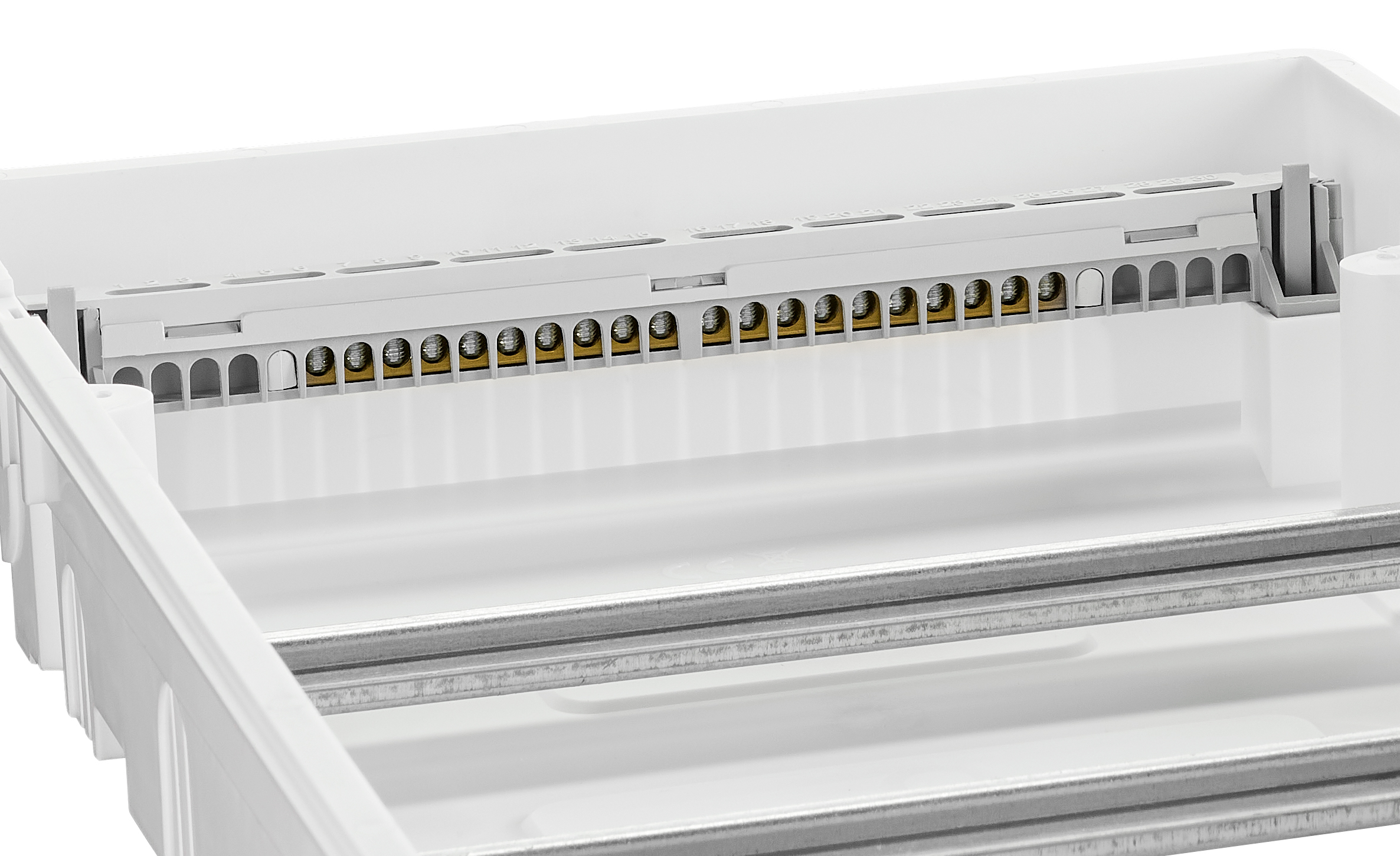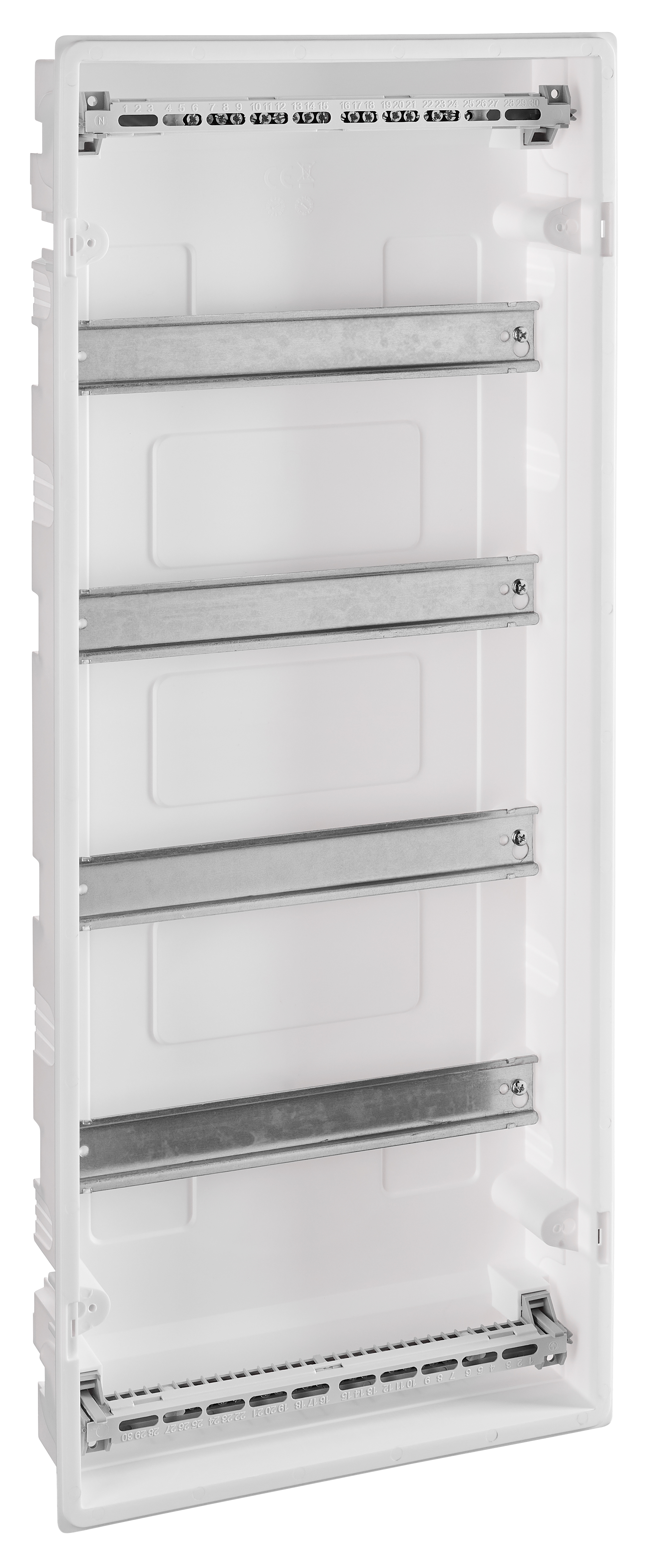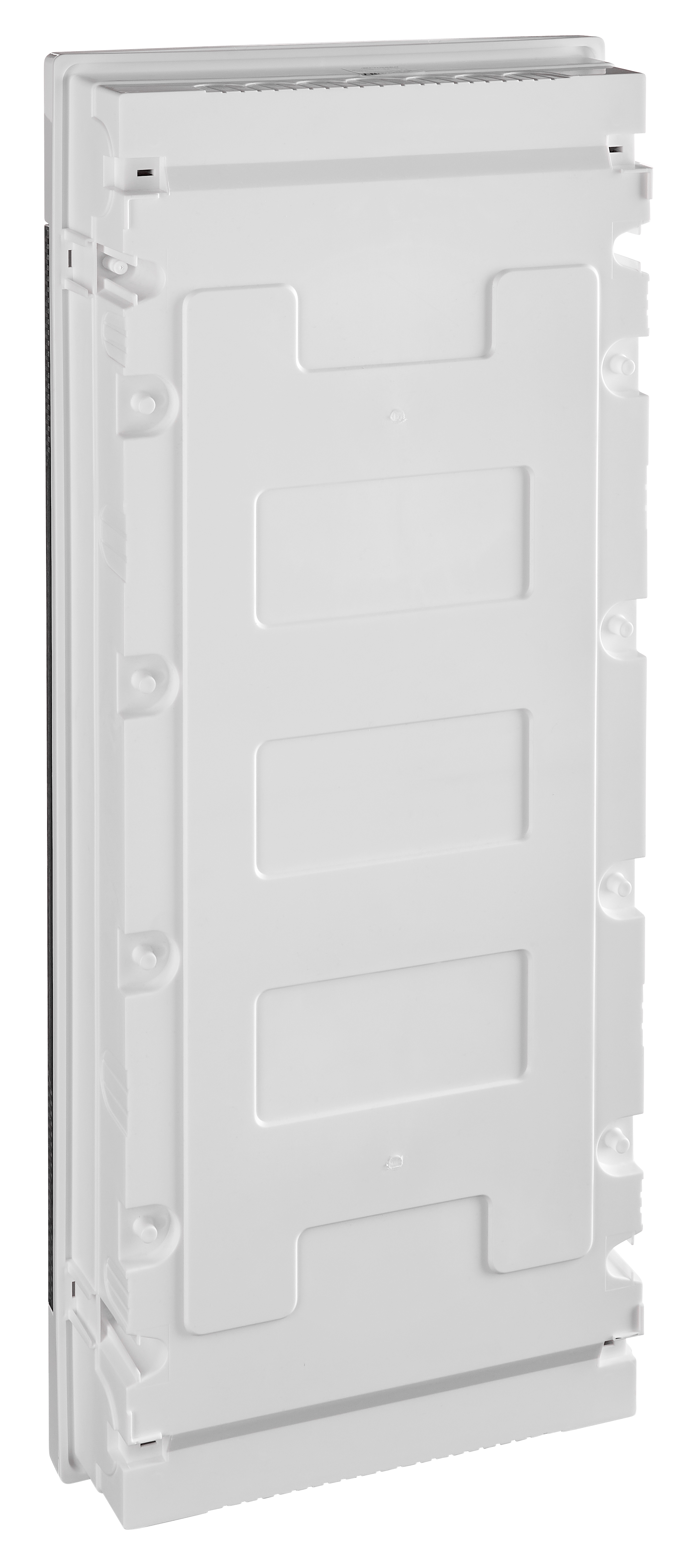 Встраиваемый распределительный щит для скрытого монтажа в стену, рассчитанный на размещение модульного оборудования.