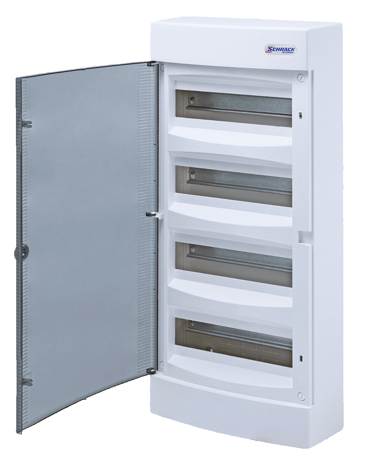 Щит электрический накладной предназначен для поверхностного монтажа с возможностью установки модульных аппаратов. Конструкция рассчитана на 4 ряда по 12 модулей в каждом (всего 48 модулей TE). Щит оснащен прозрачной пластиковой дверцей, позволяющей визуально контролировать состояние установленных устройств без её открытия.