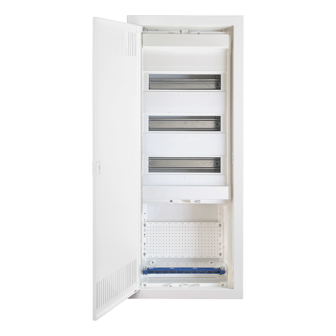 Щит встраиваемый комбинированный предназначен для встроенного монтажа в стены и перегородки. Конструкция включает 36 модулей для однофазных/трёхфазных аппаратов, 6 дополнительных модулей и 1 IT монтажную панель для специальных систем заземления.