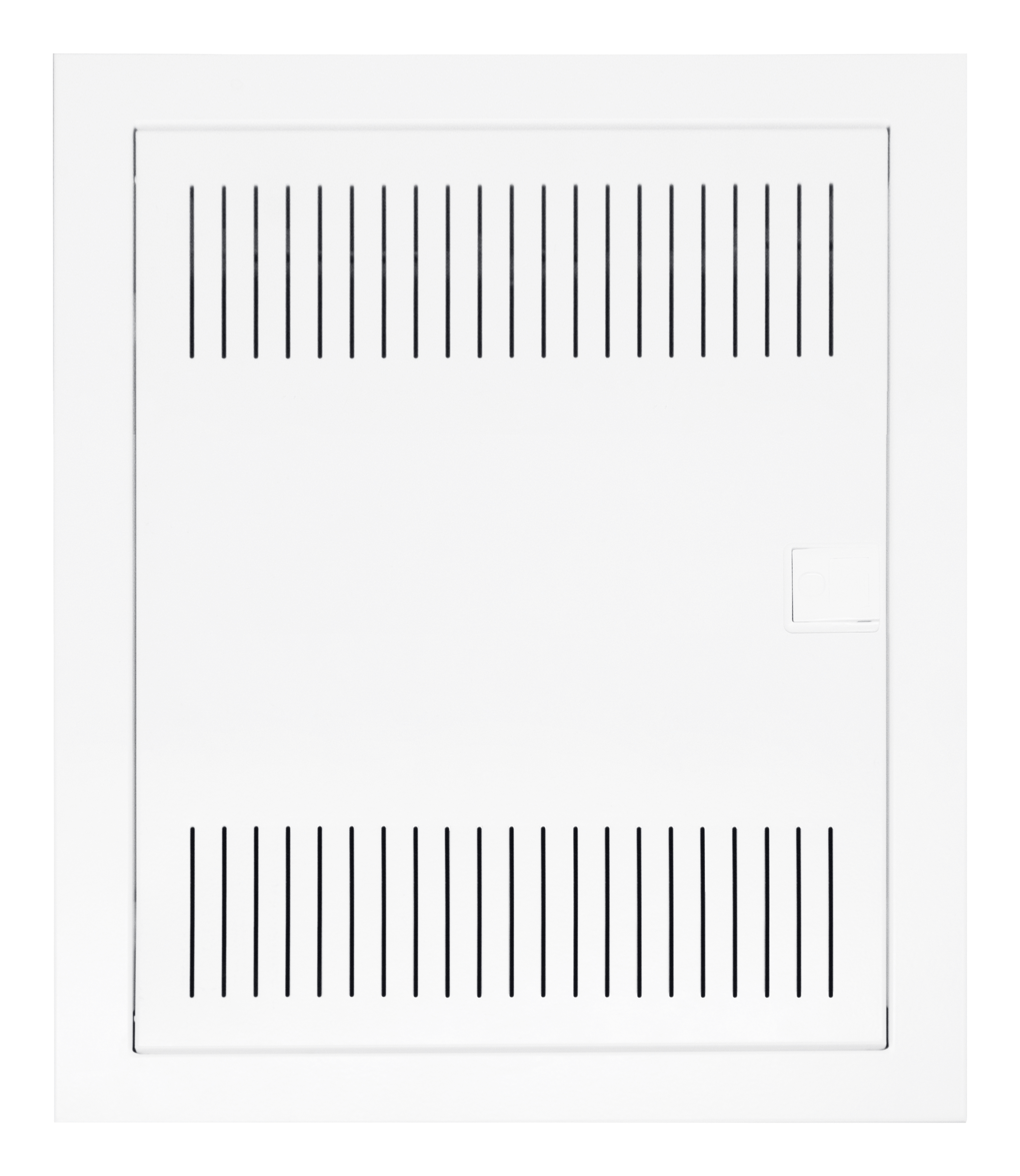Встраиваемый щит IT с дверью и рамой для скрытого монтажа в стену. Конструкция рассчитана на размещение 12+2 модулей в 2 ряда с пластиковой монтажной панелью для установки DIN-компонентов.