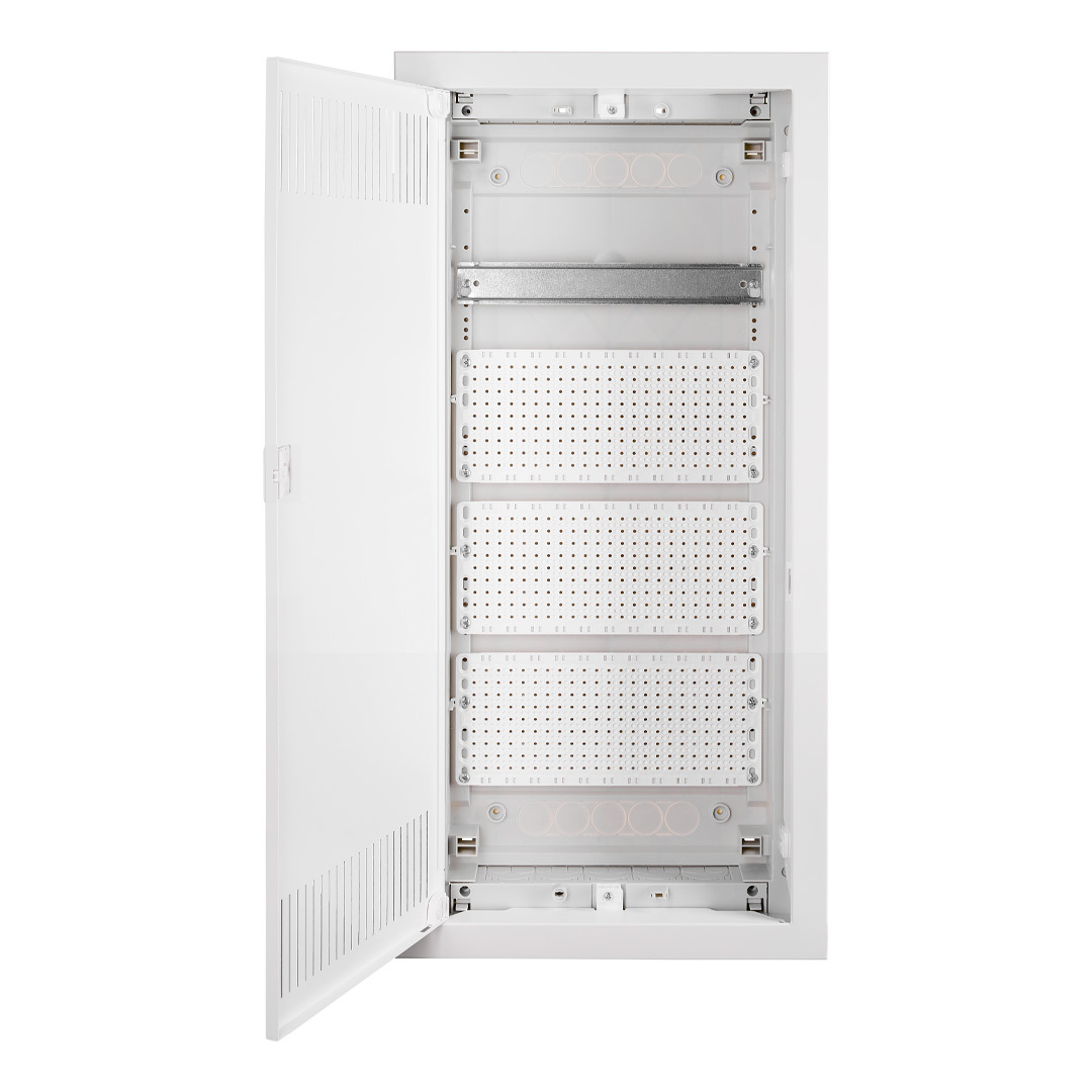 Встраиваемый щит IT четырёхрядный на 12+2 модулей с тремя пластиковыми монтажными панелями. Предназначен для распределения и коммутации электроэнергии в сетях информационных технологий.