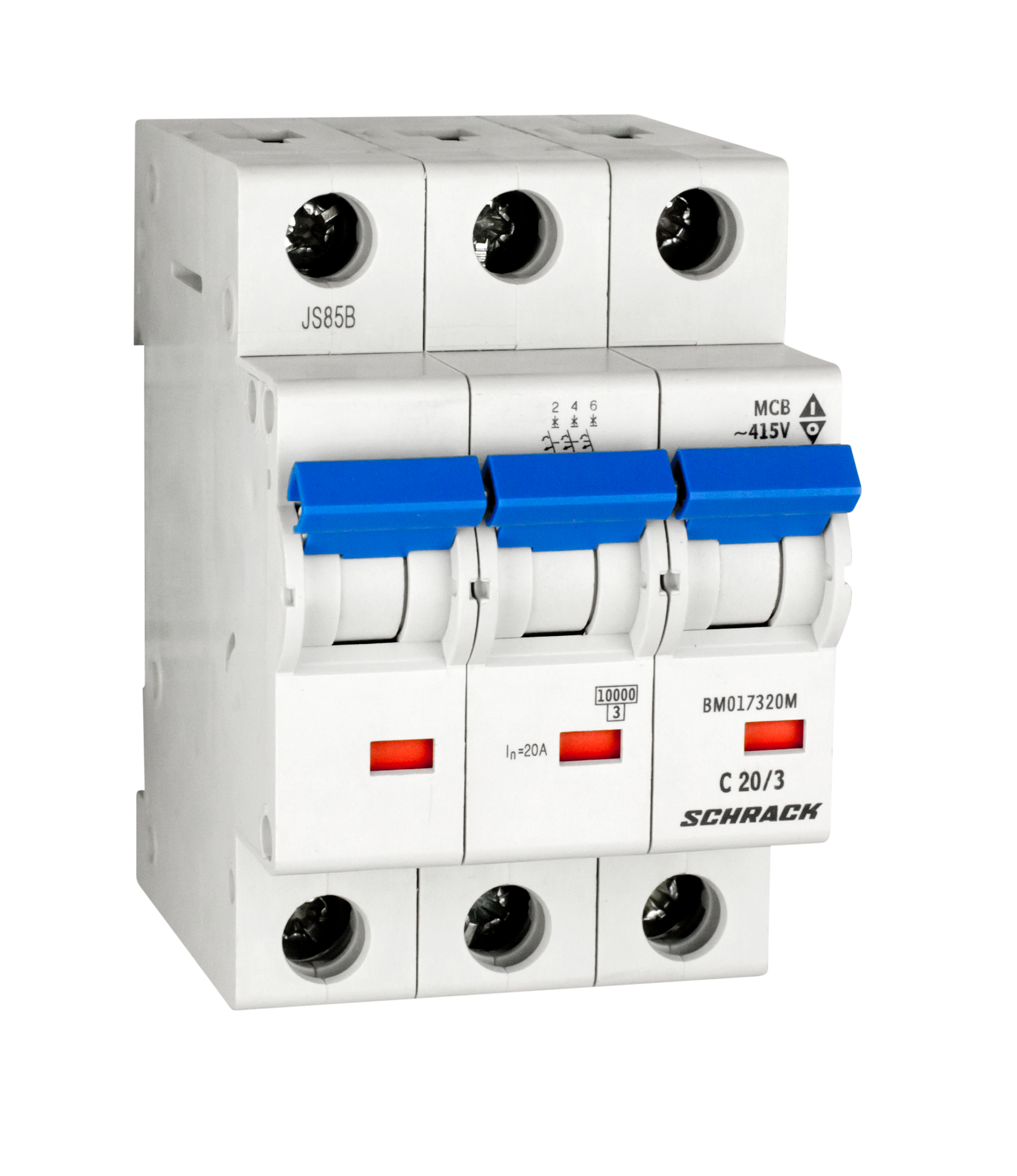 Трёхполюсный автоматический выключатель серии BMS0 производства Schrack с номинальным током 20A и коммутирующей способностью 10kA. Предназначен для защиты электрических цепей переменного тока от перегрузок и коротких замыканий.