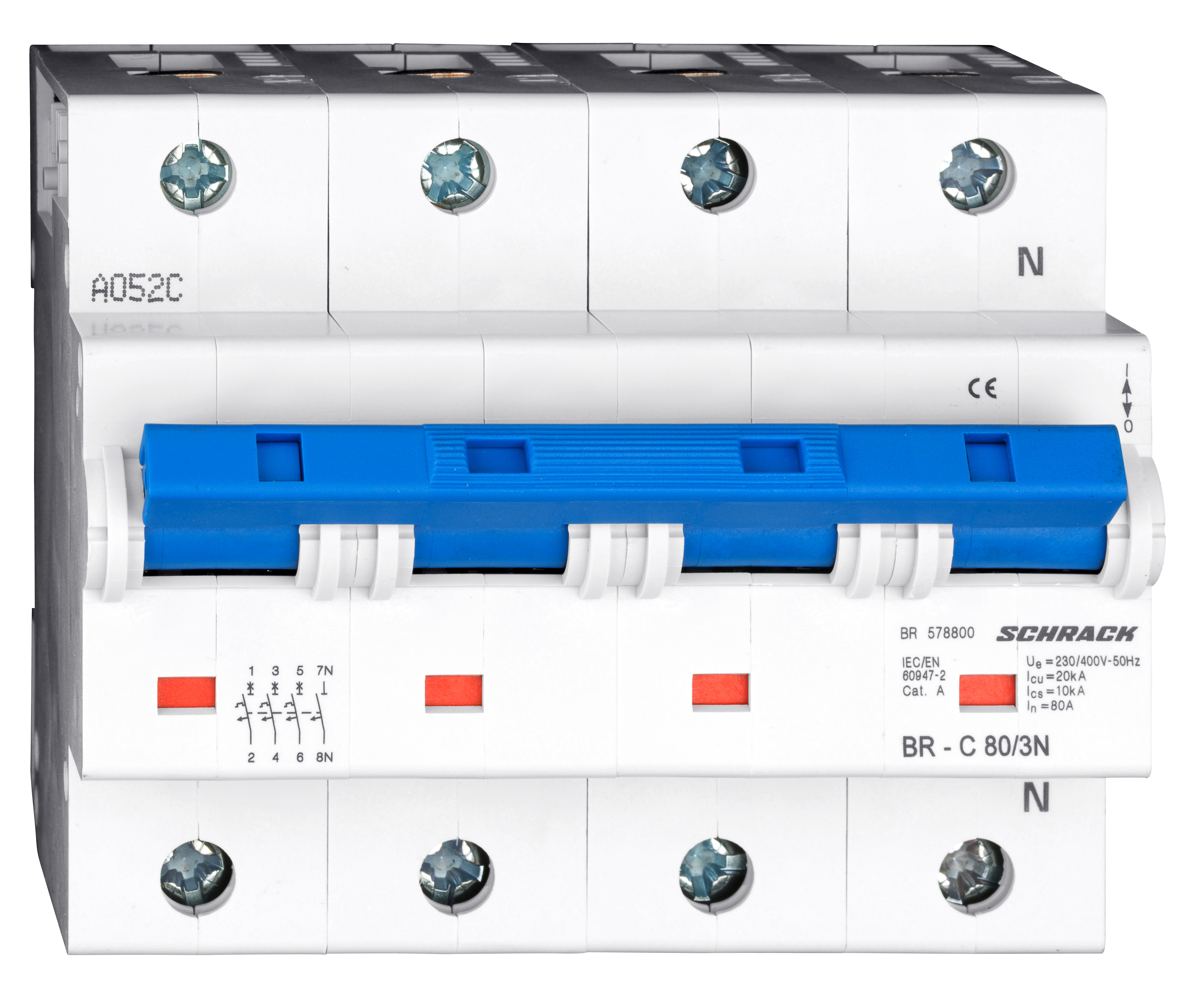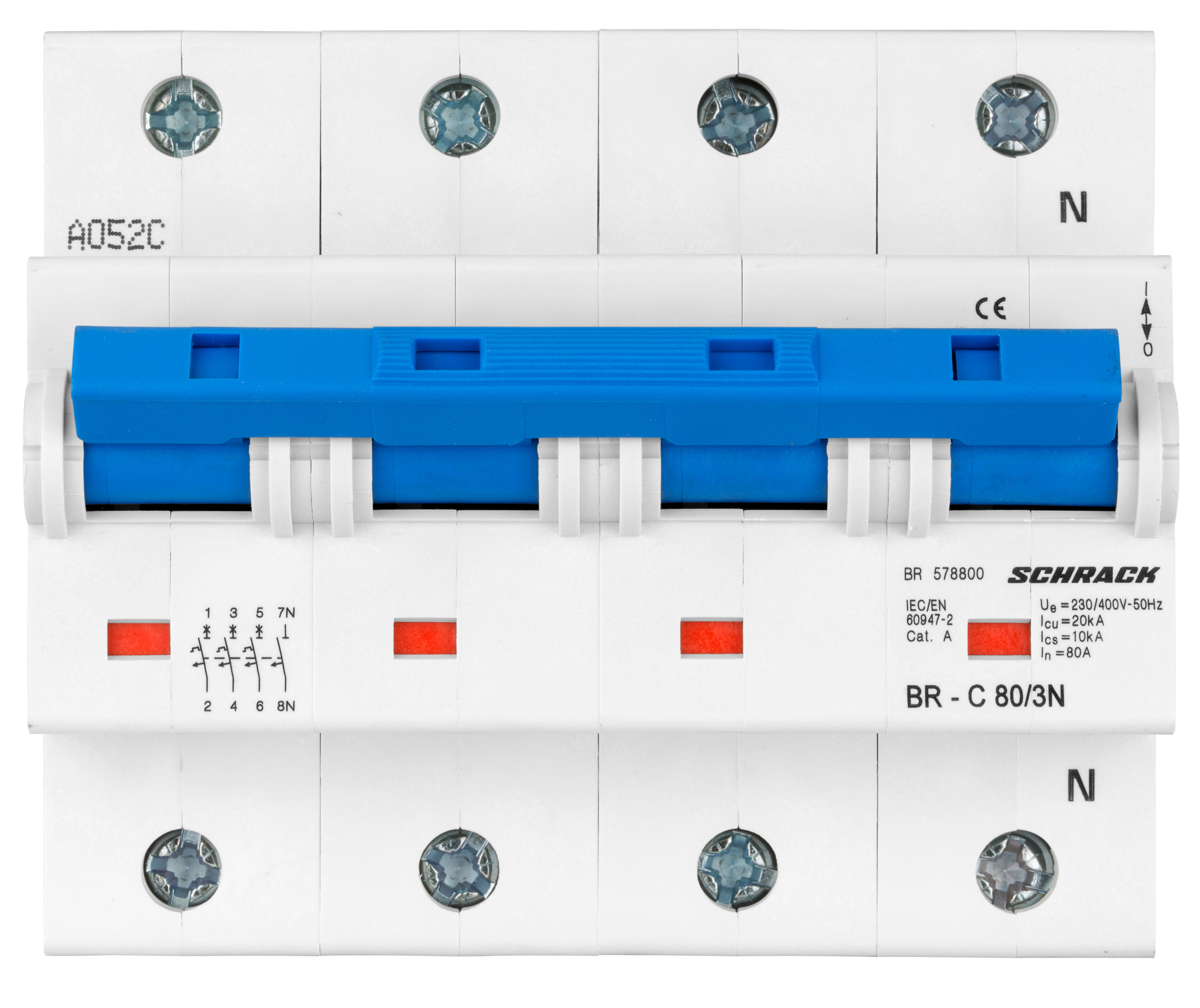Автоматический выключатель трёхполюсный с нейтралью (3+N) серии BR от производителя Schrack. Предназначен для защиты электрических цепей от перегрузок и коротких замыканий.