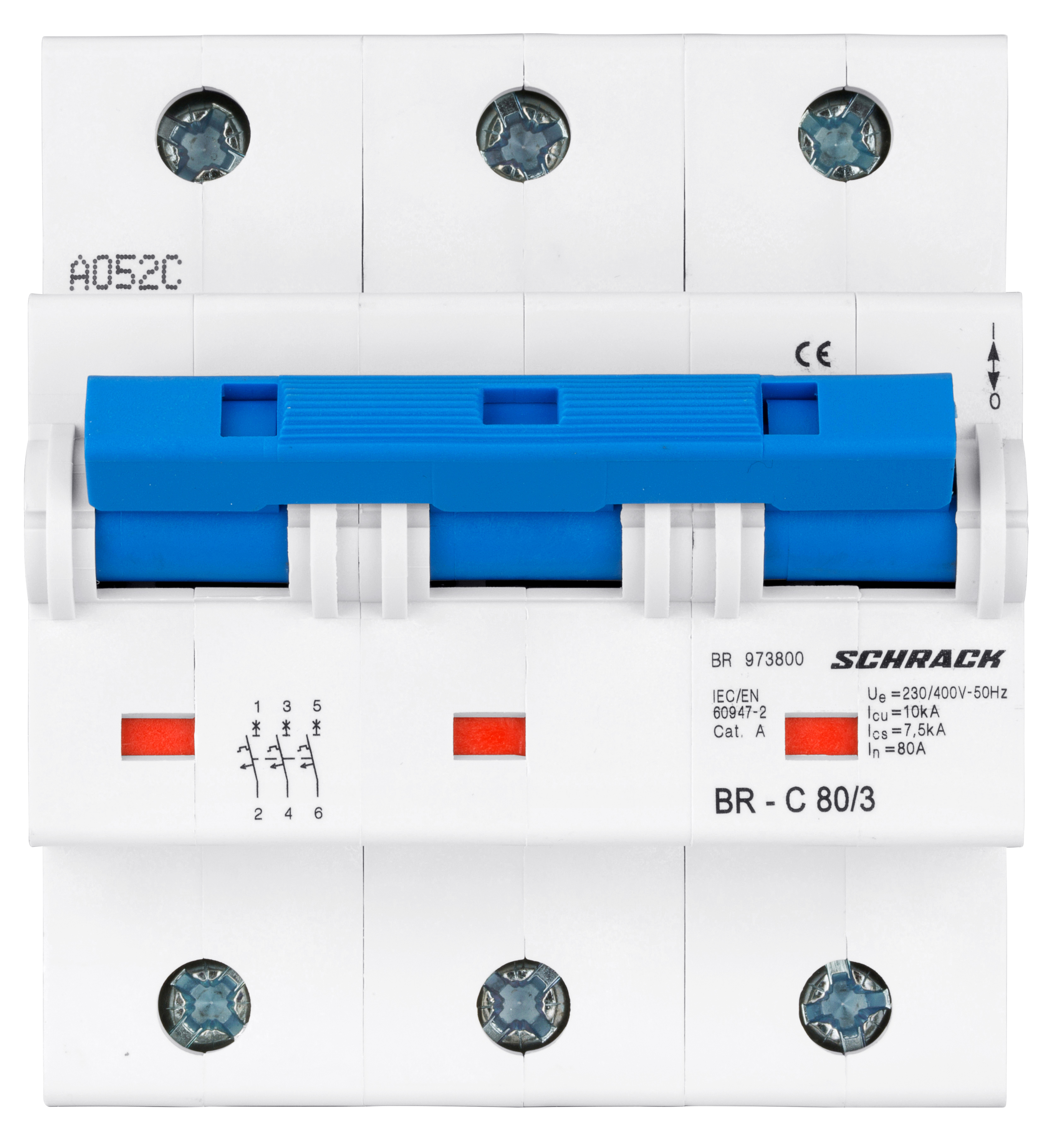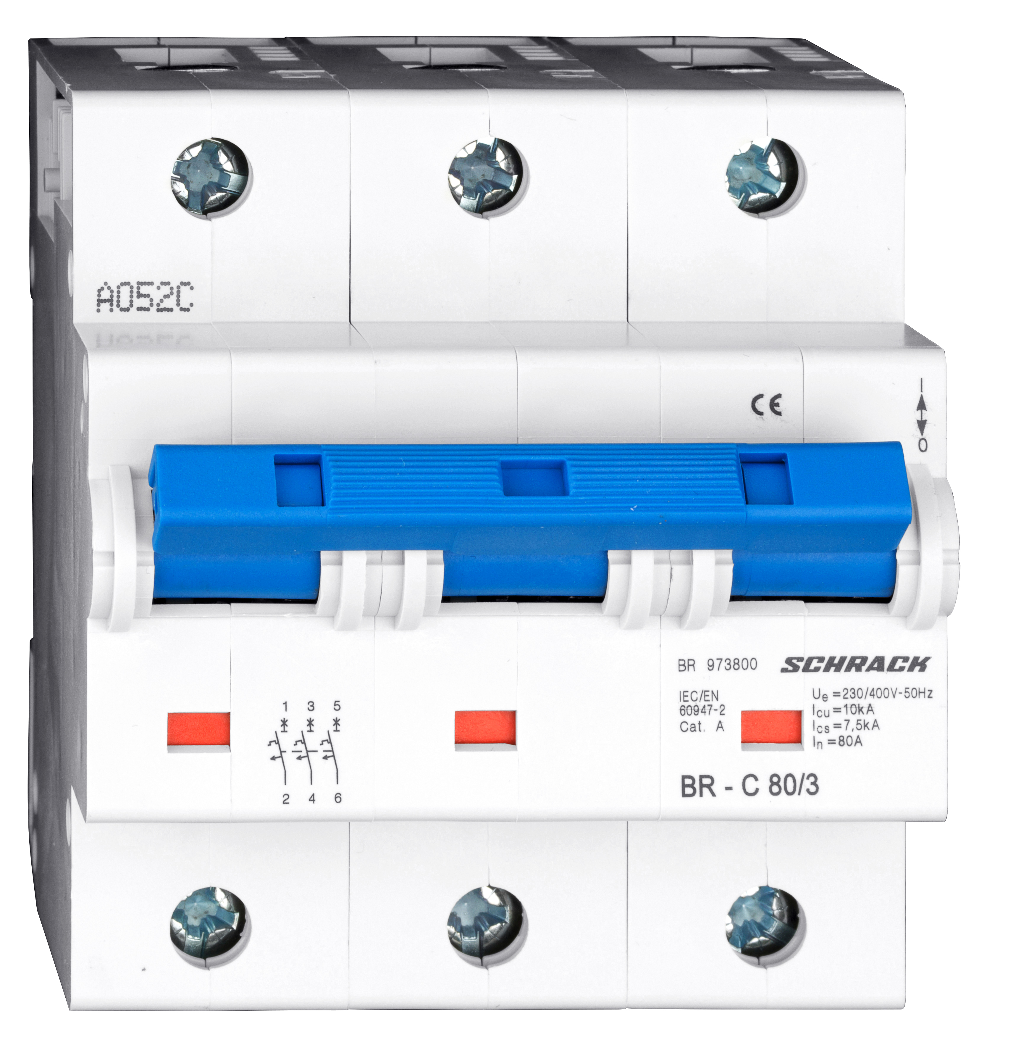 Трехполюсный автоматический выключатель серии BR для высоковольтных сетей. Номинальный ток: 80 А. Коммутирующая способность: 10 кА. Характеристика срабатывания: C (стандартная характеристика для защиты кабелей и распределительных цепей).
