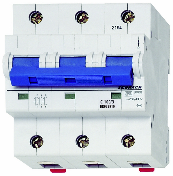 Автоматический выключатель трёхполюсный с номинальным током 100 A и коммутирующей способностью 10 kA. Предназначен для защиты электрических цепей от перегрузок и коротких замыканий в системах переменного тока.