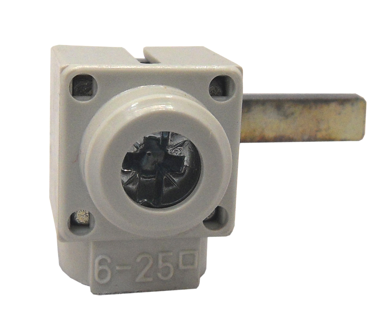 Зажим штырьковый с боковым подключением для проводников сечением 6-25 мм². Компактная конструкция короткого типа обеспечивает надёжное соединение в стеснённых условиях монтажа.