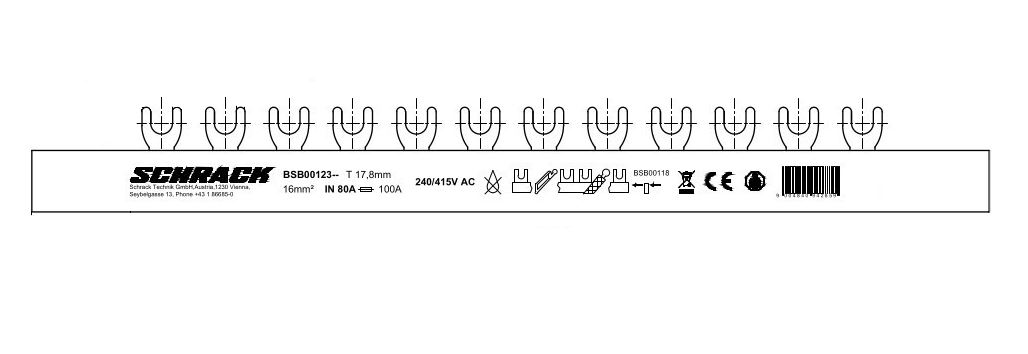 Гребенчатая шина для подключения устройств со следующими элементами: клемма двойного назначения, винтовая клемма, винтовое соединение, плоская клемма. Делительное устройство 17,8 мм. 27 x 1+N. Чередование фаз: L1, N, L2, N, L3, N, ... . Торцевые заглушка не требуются