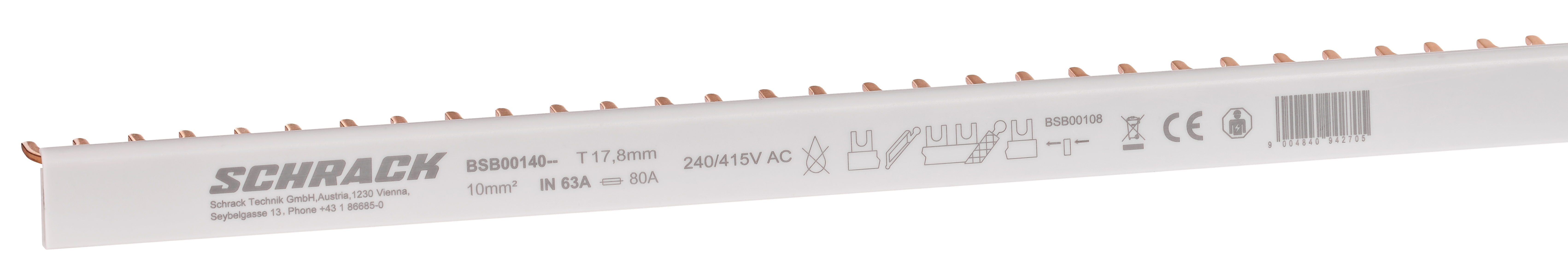 Гребенчатая шина для подключения устройств со следующими элементами: клемма двойного назначения, винтовая клемма, винтовое соединение, плоская клемма. Делительное устройство 17,8 мм. 57 МВт