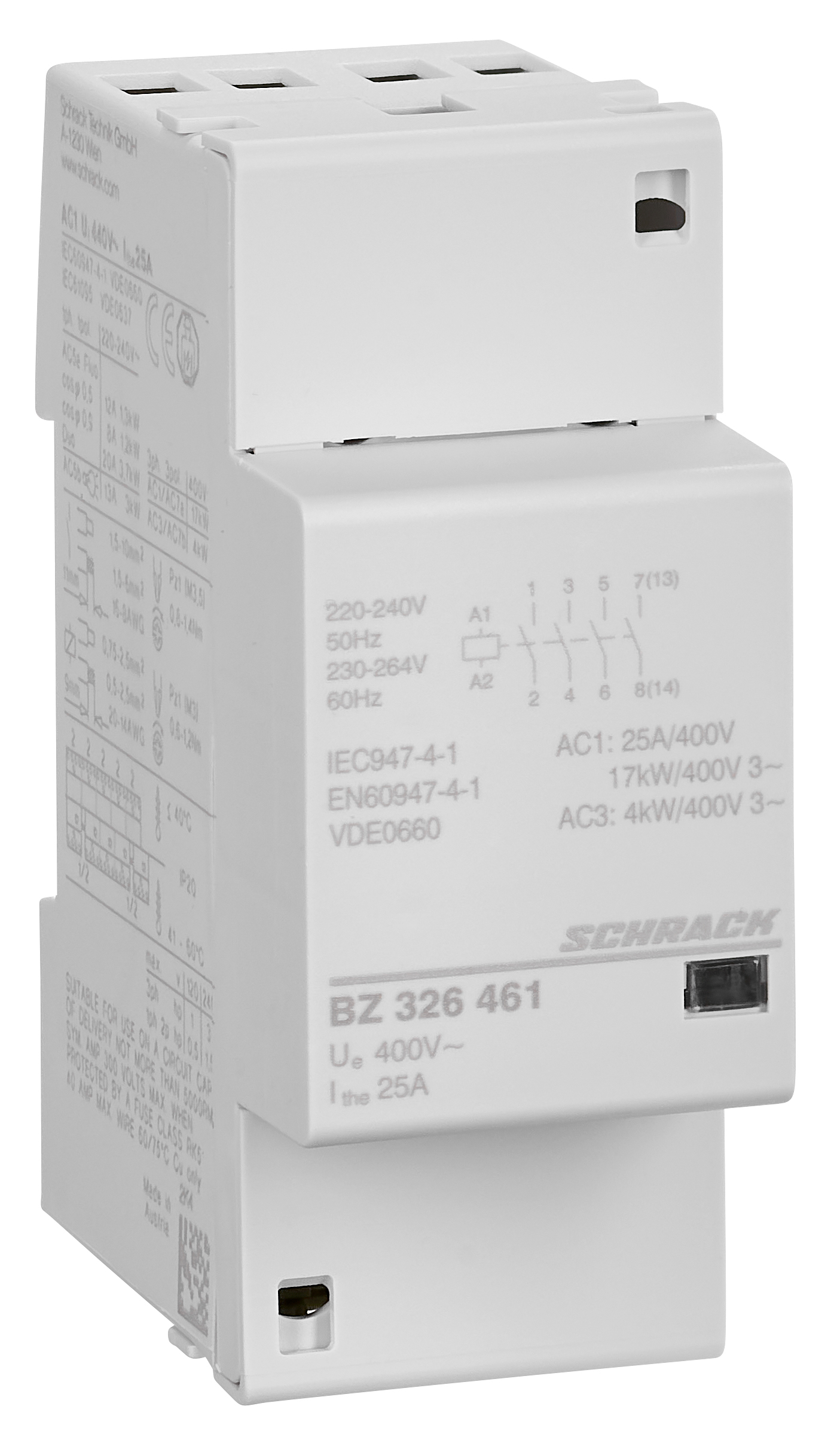 Модульный контактор предназначен для коммутации силовых цепей переменного тока в промышленных и бытовых электроустановках. Устройство имеет четыре нормально разомкнутых контакта (4NO) и рассчитано на номинальный ток 25A при напряжении катушки 230VAC.