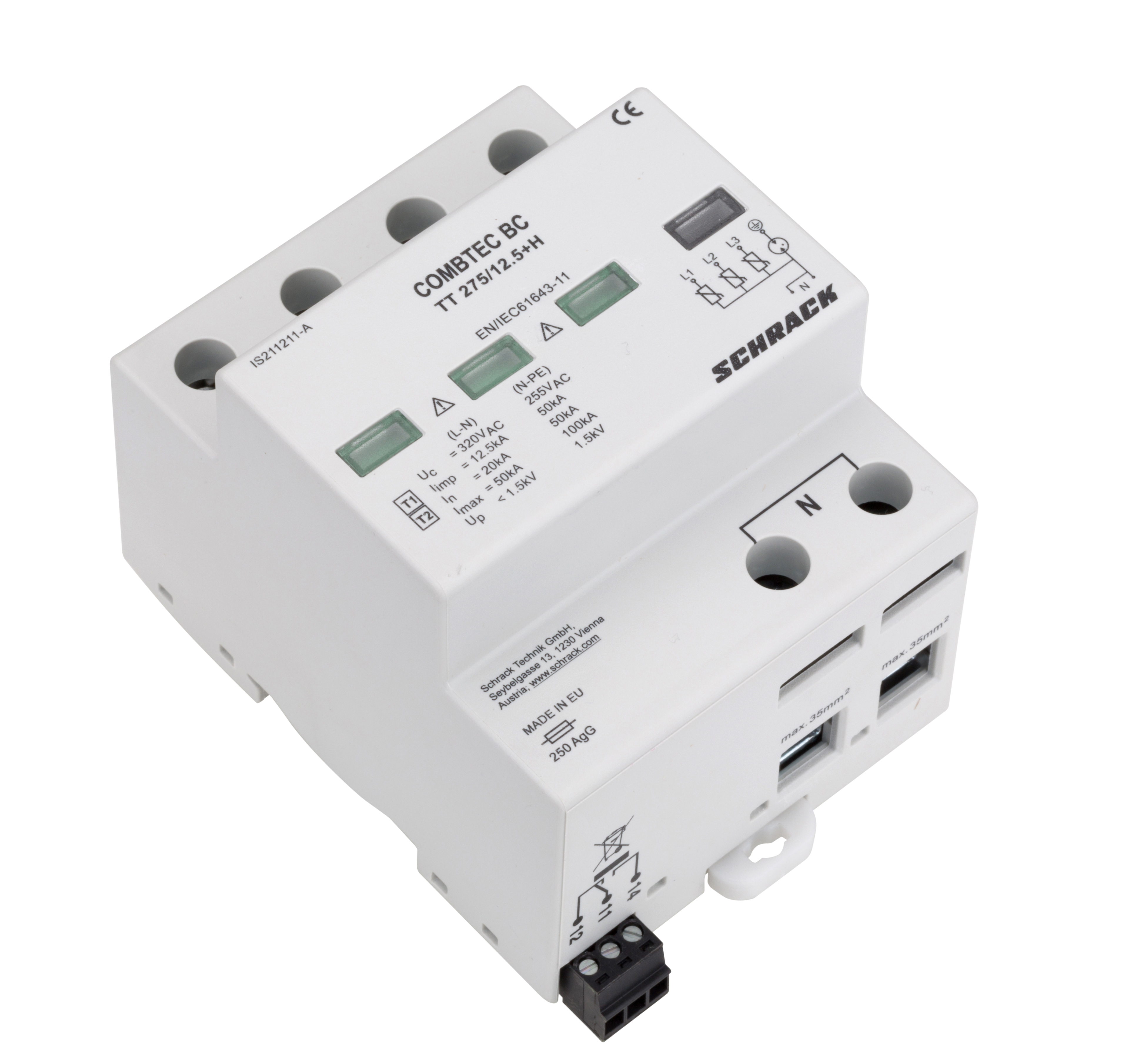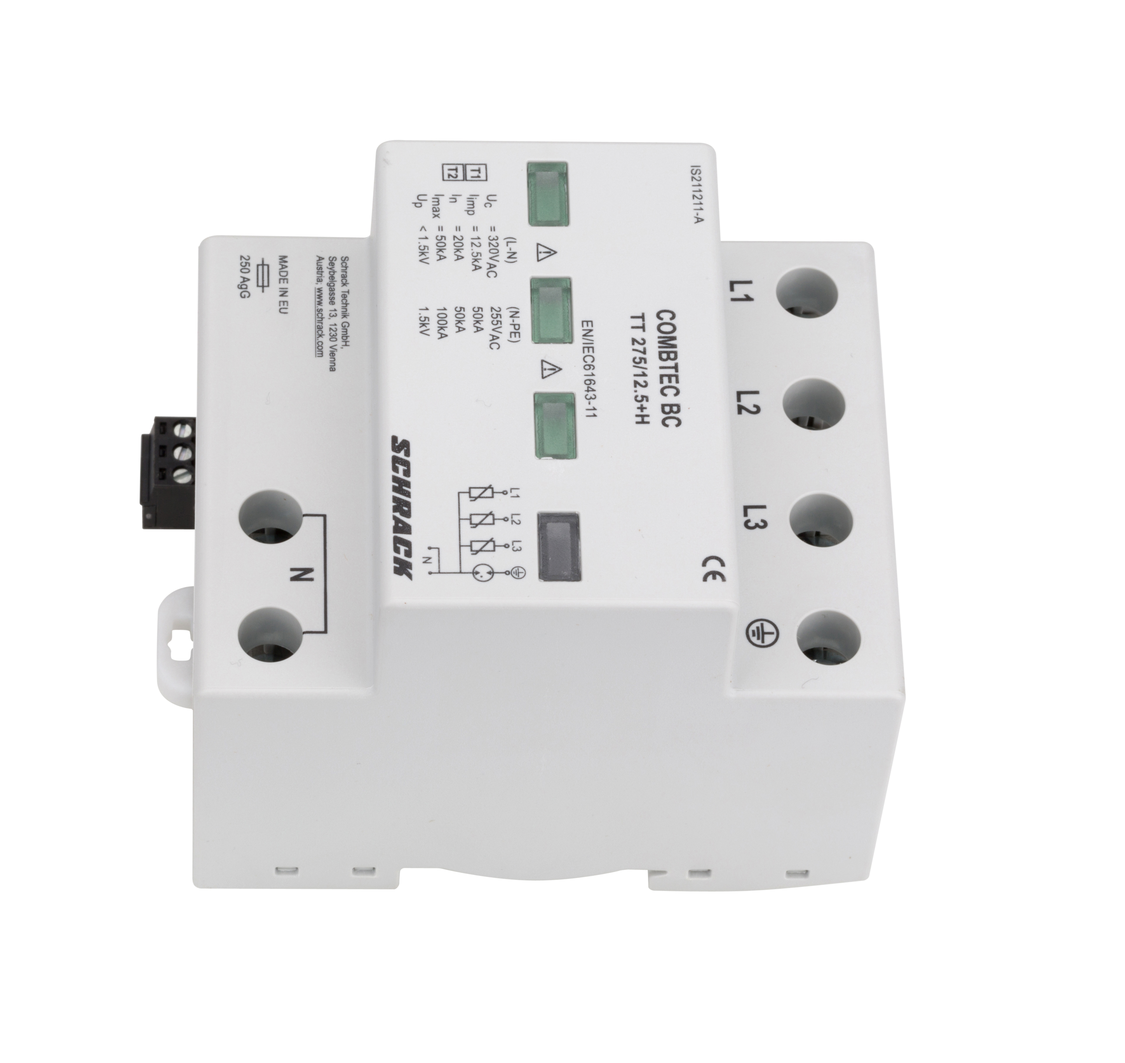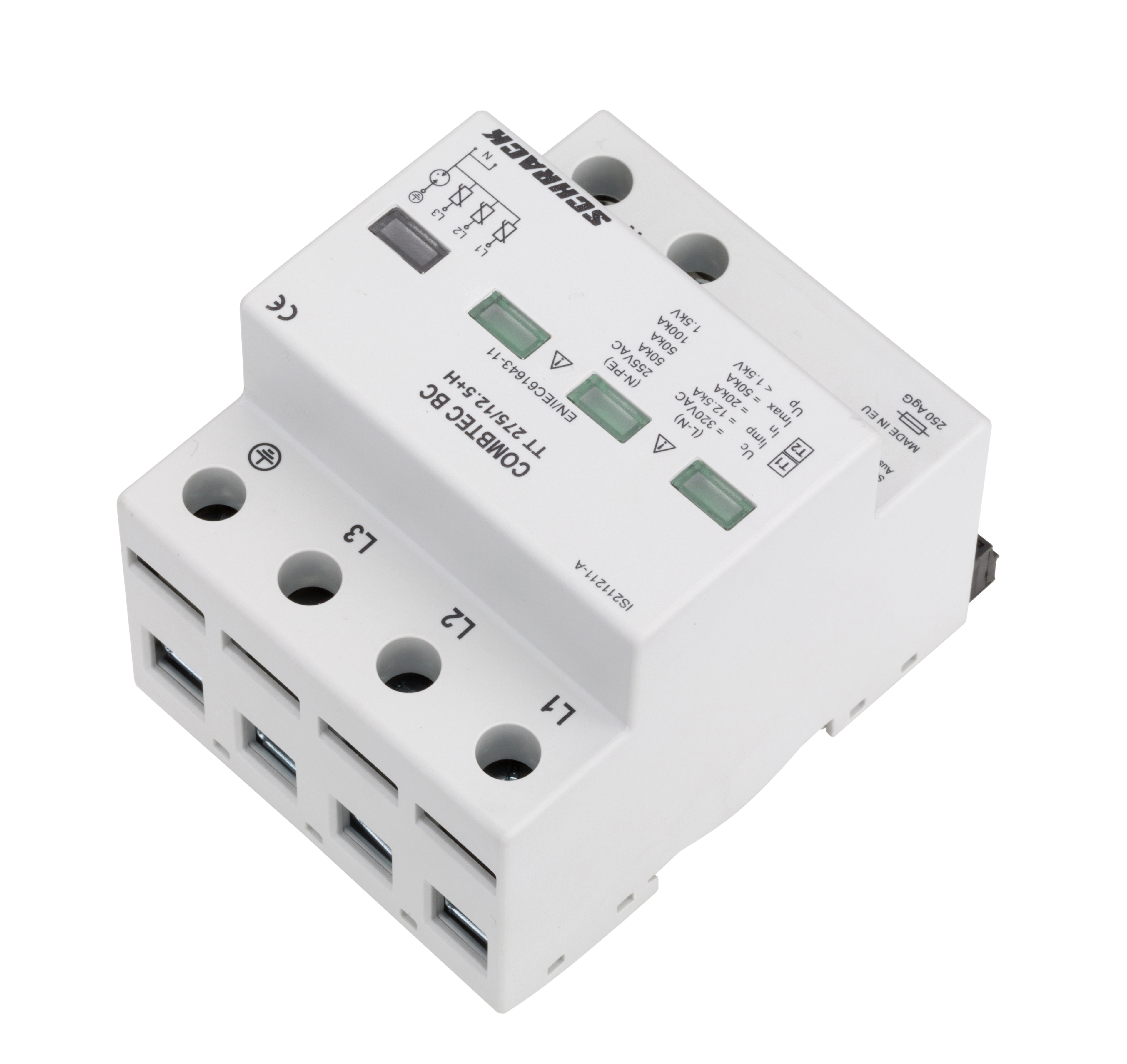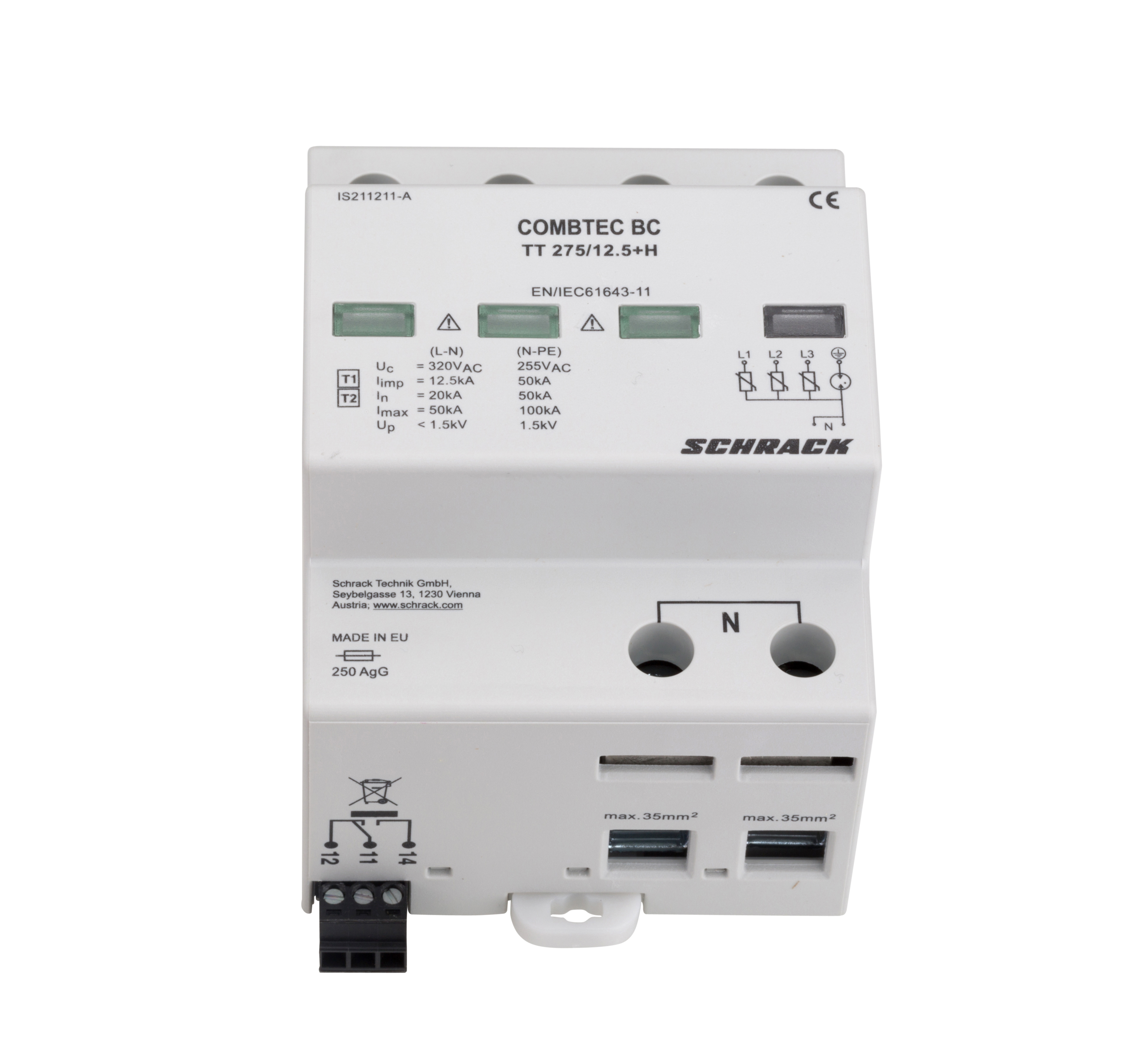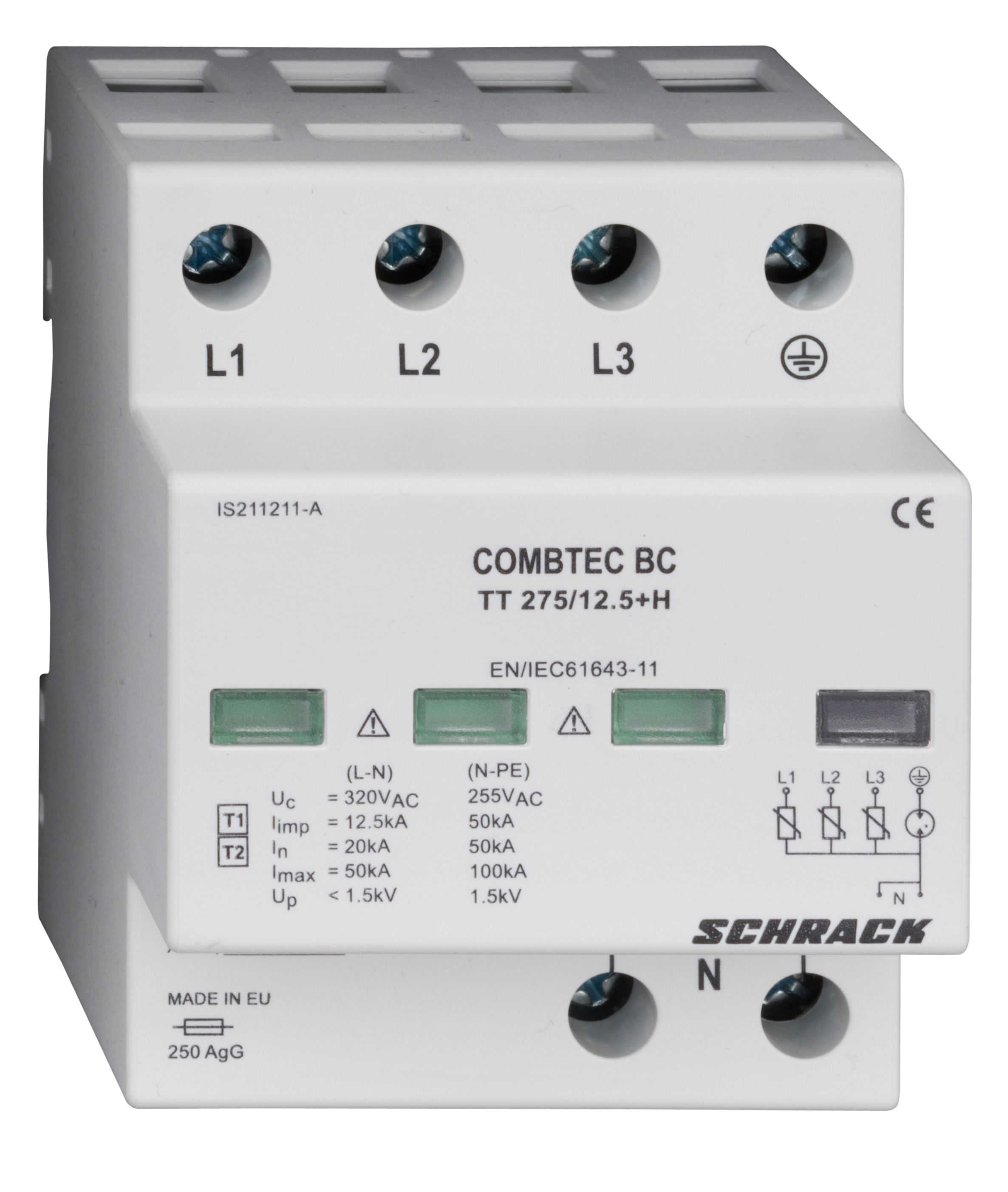 УЗИП COMBTEC BC TT 275/12.5kA+RC — устройство защиты от импульсных перенапряжений (УЗИП) для трёхфазных систем электроснабжения с нулевым проводом.